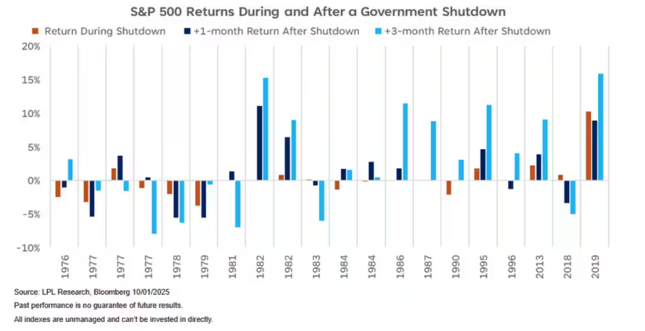 特恩奎斯特写道:「尽管政府停摆给市场带来了新一层不确定性,但从历史来看,停摆持续时间较短,因此对经济的影响微乎其微。投资者通常会忽略与预算相关的干扰,更关注企业盈利、整体经济趋势及其他关键宏观经济因素。」
