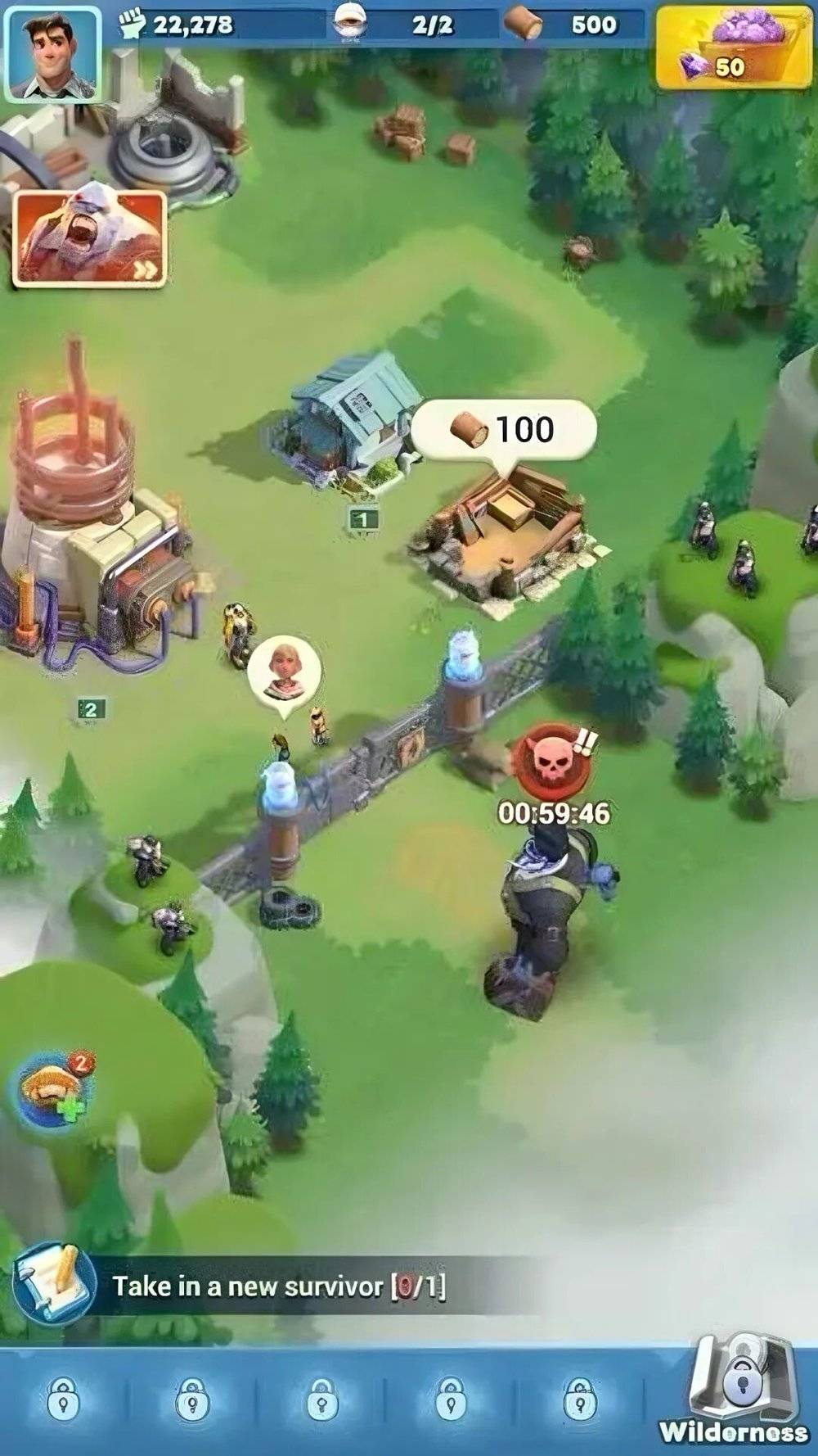 在初期,玩家在 「末日」 设定下最大程度地享受休闲类玩法。生存没有难度,就算是新手也毫无门槛,只需要在关键节点买礼包、狩猎、采集资源,靠简单便捷的快速升级体验爽感和成就感。