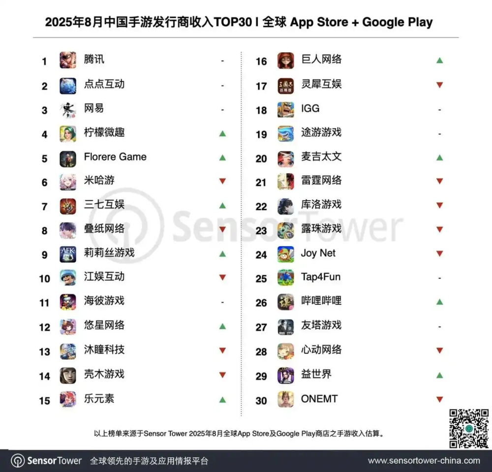 Sensor Tower8 月发布的全球手游发行商收入榜 TOP100 中,有 32 家中国厂商上榜。据统计,这 32 家公司合计营收 20.4 亿美元,占榜单发行商总收入的 35.1%。