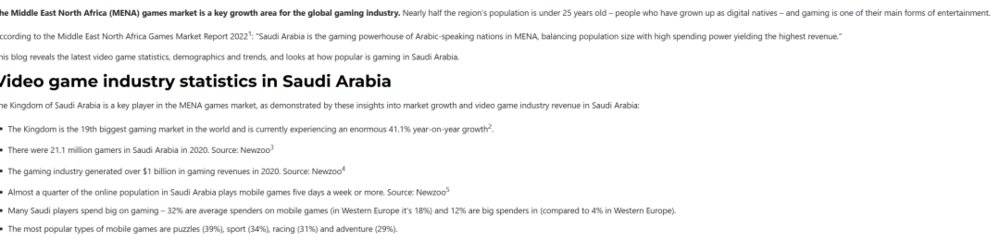 根据 《2022 年中东和北非市场游戏报告》 的内容显示,沙特目前是全球第 19 大游戏市场,且年增长率高达 41.1%,游戏玩家数更是增长到了 2110 万人,其游戏产业更是创造了超过 10 亿美元的收入。