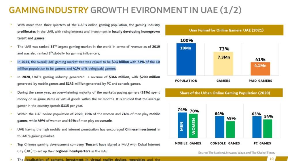 而与之并称为 「阿拉伯半岛二雄」 的阿联酋也在 2021 年时达到了 4 亿美元规模的游戏市场估值,其千万级别人口中有 73% 为玩家,41% 为付费玩家,而它也和沙特一样,不仅入股游戏公司,也涉足了电子竞技行业。