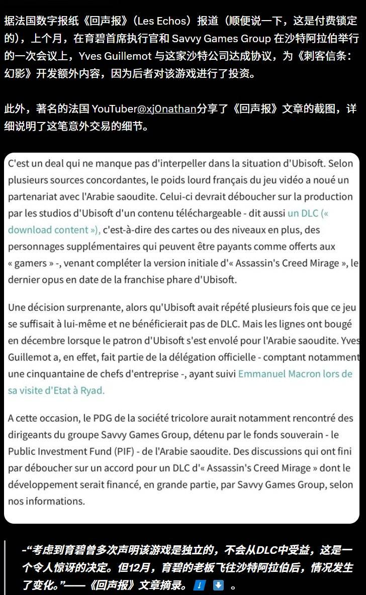 根据法国数字报纸 《Les Echos》 所报道,育碧首席执行官就与 Savvy 在 24 年 12 月于沙特进行过的一场会议,最终双方达成了协议,并形成了如今的 《刺客信条:幻景》 新 DLC,这大抵是 Savvy 直接全包了费用,育碧只要做好游戏内容 (并免费送给所有玩家),好好宣传下阿拉伯世界就行。