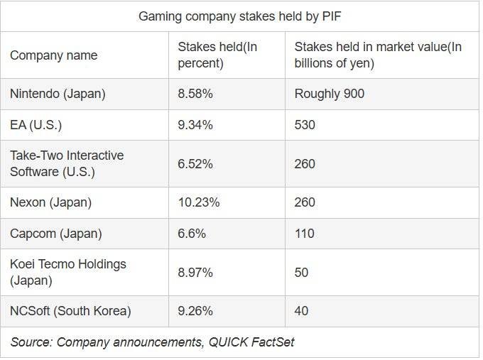 根据日本 《产经新闻》 于 2024 年 9 月的一份报道所示,在那时候 PIF 已经拥有了世界上众多著名游戏公司的股份,且股份程度也具备一定规模: