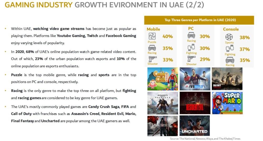 无独有偶,同样热心于游戏产业的阿联酋也一样具有着类似的环境。其国内市场不仅对于传统 「枪车球」 类游戏有着不低兴趣,而且喜好的游戏类型也与市面上大家所畅玩的游戏类型是一致的,消费能力上也日益增长,玩家也越来越愿意在游戏中进行消费。