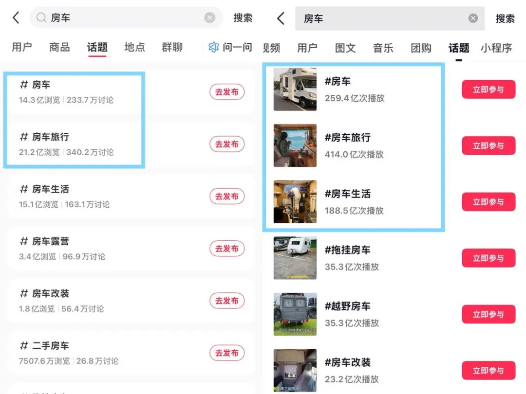 社交平台上的数据更为直观地反映了这股房车热潮。在小红书上,关于“ 房车”“ 房车旅行” 等相关话题累计超 50 亿次浏览,抖音上热度更甚,相关话题累计播放超 950 亿次。