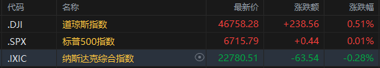 截至收盘,道琼斯指数涨 0.51%,报 46758.28 点;标普 500 指数涨 0.01%,报 6715.79 点,双双刷新了前一天录得的收盘纪录;纳斯达克综合指数跌 0.28%,报 22780.51 点。