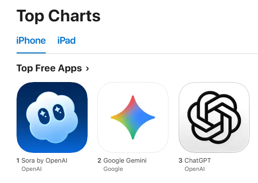 OpenAI再造爆款?AI视频社交应用Sora问鼎苹果热门App榜单