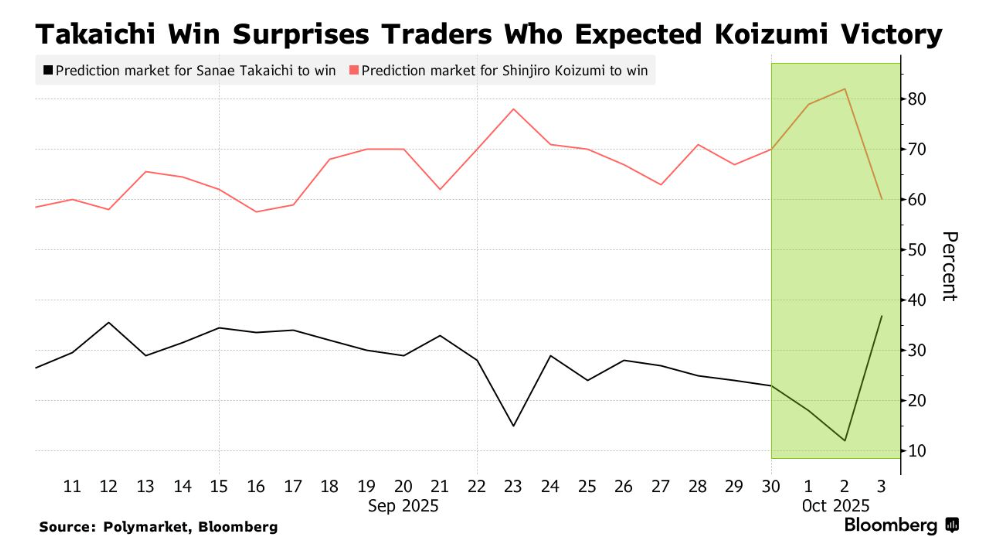 在上周六赢得自民党领袖选举后,高市早苗有望成为日本首位女首相。投资者此前曾预计这一职位将由政治世家子弟小泉进次郎 (Shinjiro Koizumi) 担任,外界认为小泉进次郎在财政方面更为谨慎,并会让日本央行推进政策正常化。