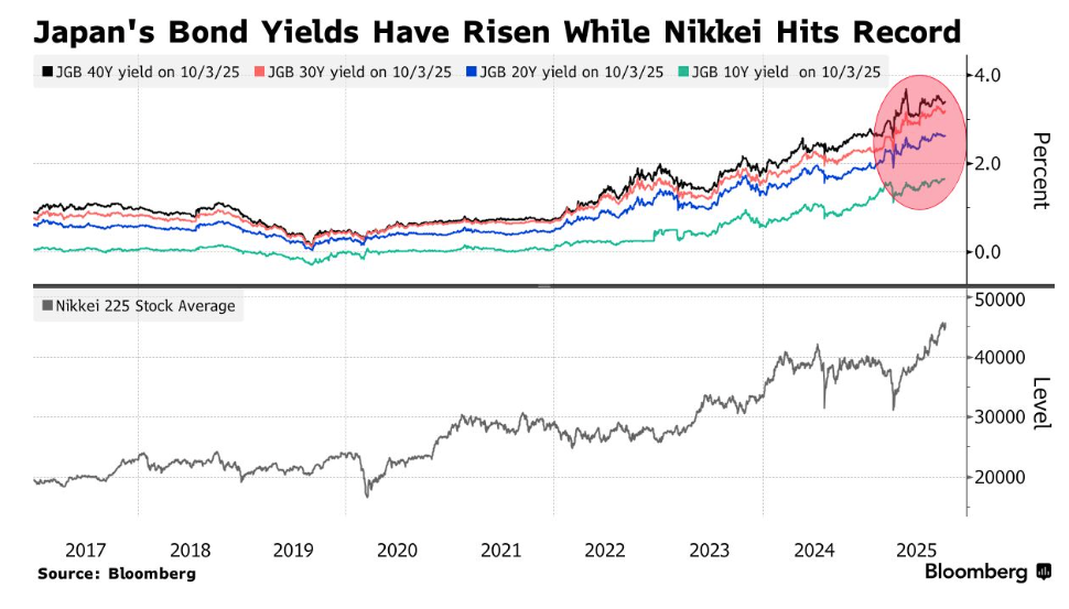 三井住友信托资产管理公司 (Sumitomo Mitsui Trust Asset Management Co.) 高级策略师稻田胜年 (Katsutoshi Inadome) 表示:「尽管不像去年的领袖选举那样明显,但市场认为财政纪律将会放松,而且她不会对日本央行的加息举措表现出太多理解。周一日本国债收益率可能会下降,尤其是 2 年期和 5 年期国债收益率,而超长期收益率则会上升。对 10 月加息的预期定价可能会有所回落。」