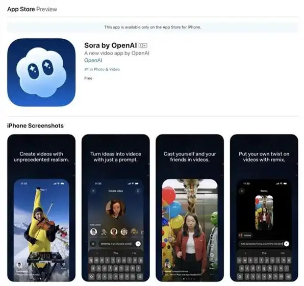 美国时间 9 月 30 日,OpenAI 发布了 Sora 2 模型,能够生成 「高度逼真」 的视频场景和音效,该模型被视为自 2024 年 2 月 OpenAI 发布首个 Sora 模型以来的重要升级。与此同时,搭载 Sora2 模型的应用 Sora 正式在苹果 App Store 上线,该应用目前仅限于美国和加拿大地区的 iOS 用户使用。上线仅四天内,Sora 便登顶苹果 App Store 的免费应用榜首,超越了谷歌的 Gemini 和 OpenAI 的另一款应用 ChatGPT。