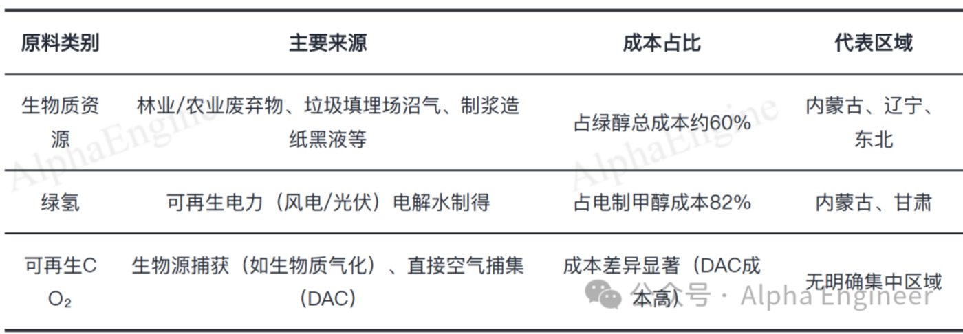 绿醇上游原材料分为生物质资源、绿氢、 可再生 CO₂三部分。