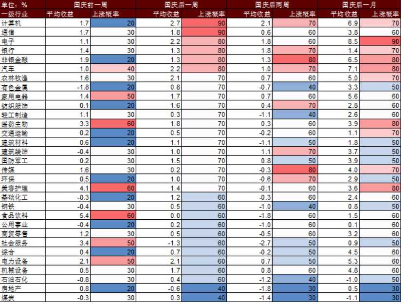招商证券张夏团队在 9 月 26 日发布的研报中表示,从近十年国庆节后行业表现来看,国庆后一周一级行业上涨概率多数在 50% 以上,其中上涨概率靠前的行业集中在计算机、通信、电子、银行等行业,其中银行、非银金融、汽车在国庆后两周和国庆后一个月上涨概率仍然较高。