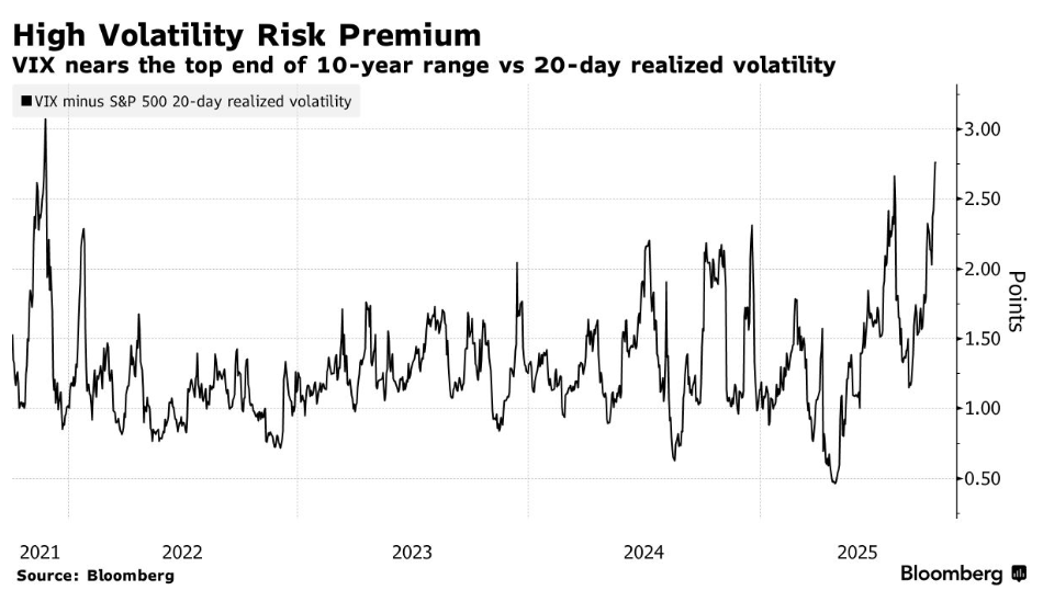 这种看似违背直觉的现象,很大程度上是因为实际市场波动过于平淡。这一情况推高了风险溢价——即交易员预期的市场波动幅度与实际波动幅度之间的差值。