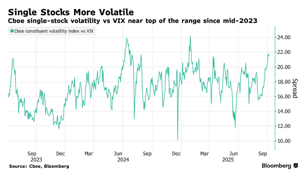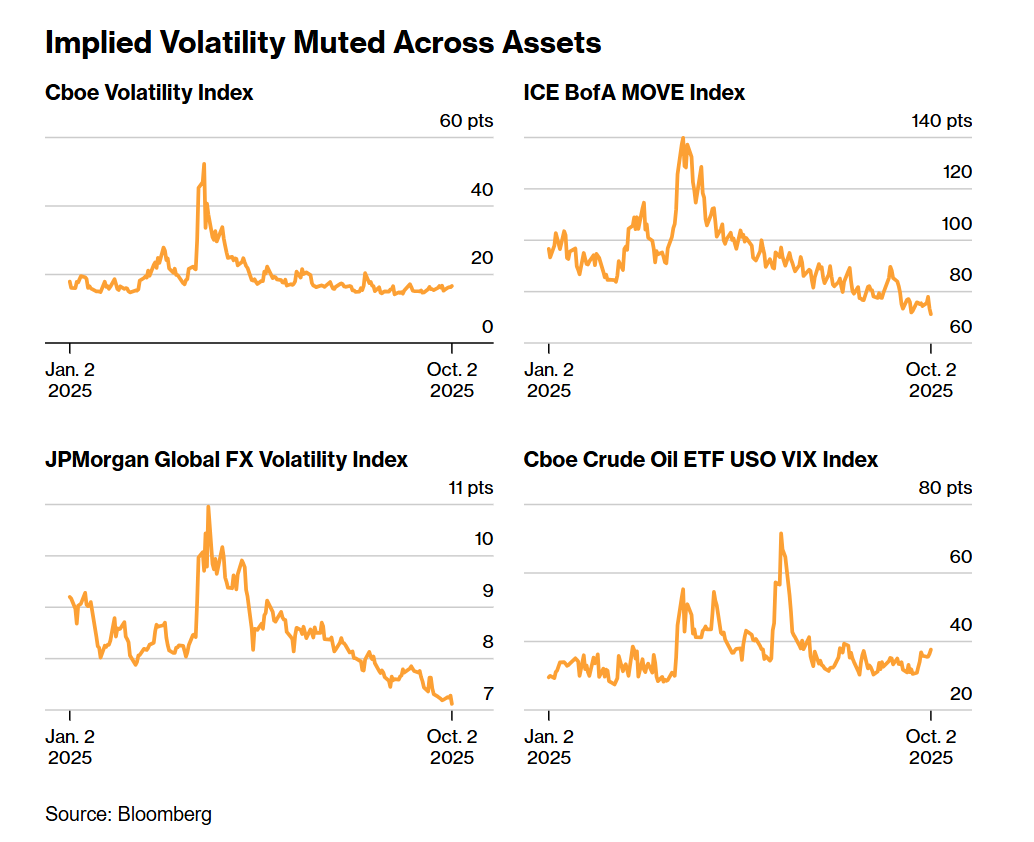 股市方面,9 月期权交易量创下纪录,随着投资者开始为年底行情增加对冲操作,对市场波动的预期有所升温。但如果实际波动始终受限,交易员愿意为期权支付的溢价也会存在上限。