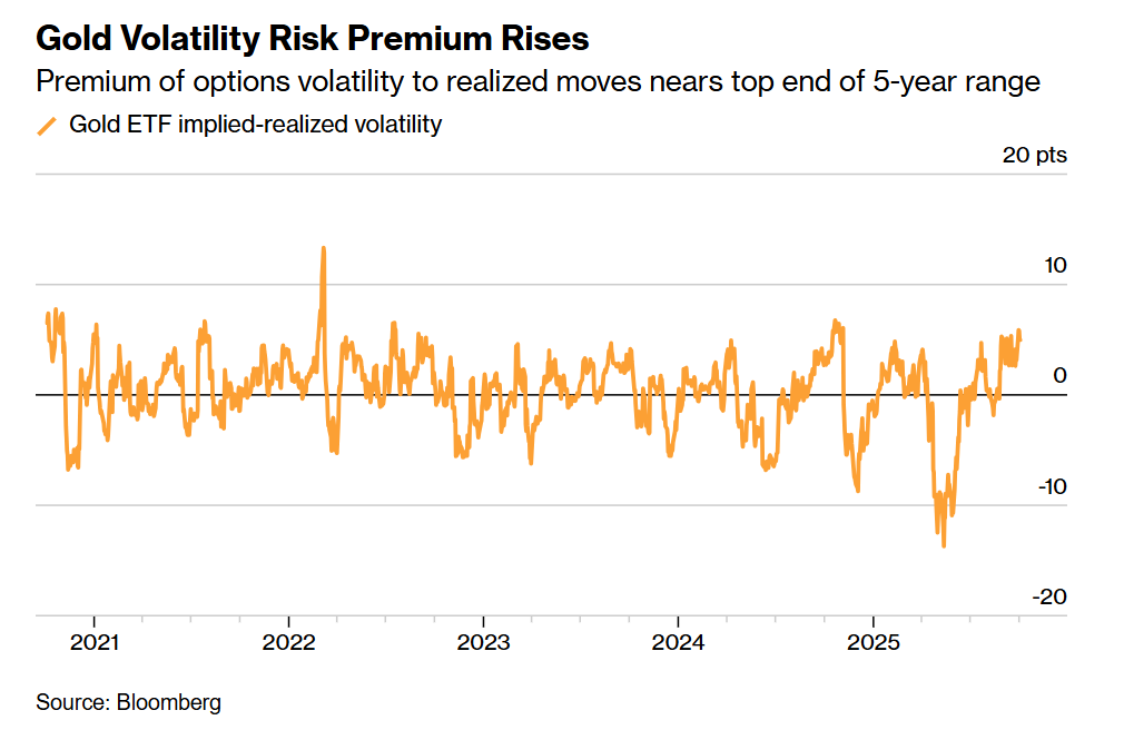 在其他一些市场,实际波动率下降是推升风险溢价的主因,但黄金是个例外。过去一个月,随着金价屡创历史新高,且美国政府停摆为投资者增添了一层不确定性,黄金的隐含波动率持续攀升,推动期权风险溢价升至过去五年区间的高位。