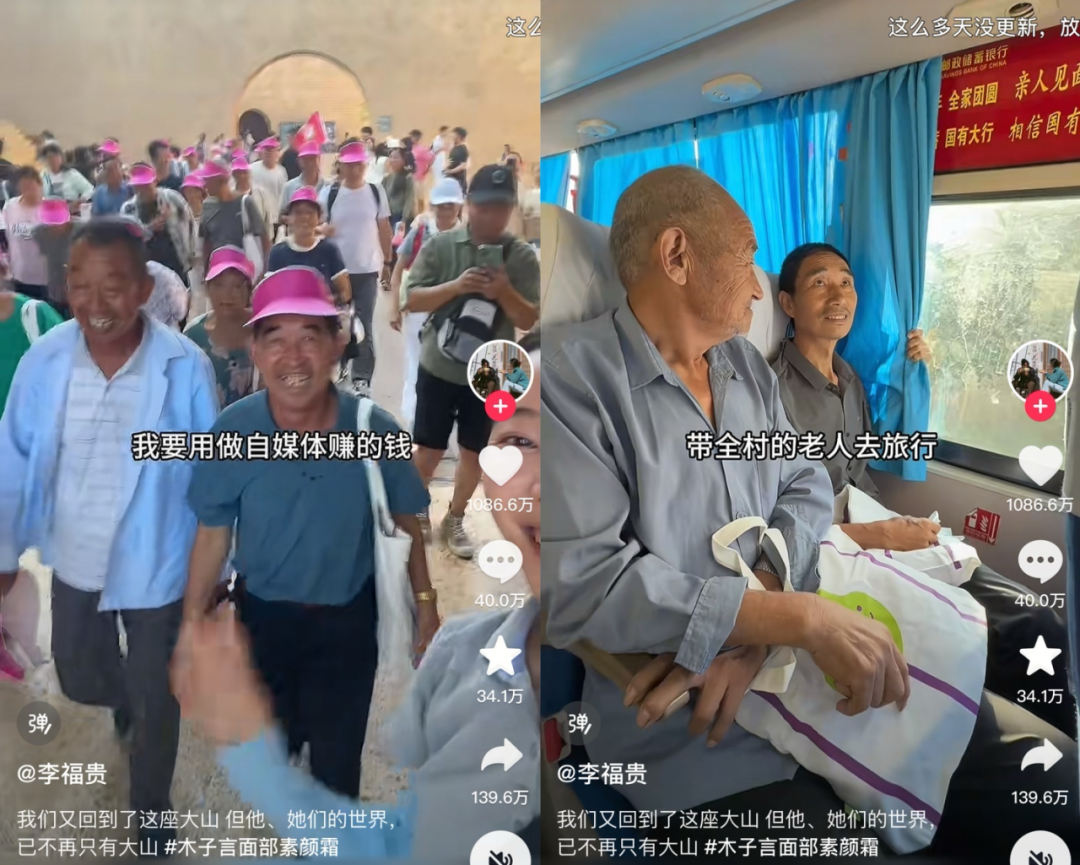 李福贵带全村老人旅游,源自她 「用做自媒体赚的钱回馈社会」 的愿望。平日里,当她拉着各种点心饼干、豆腐、蔬菜水果穿梭于各个乡村时,卖的货不仅便宜,还会在温情唠嗑中习惯性地给老人们抹去零头。