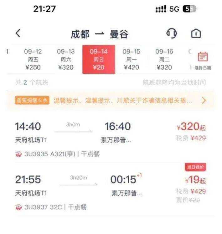 9 月 14 日 21 时 55 分从成都飞曼谷的票价为 19 元起/图源:社交媒体截图