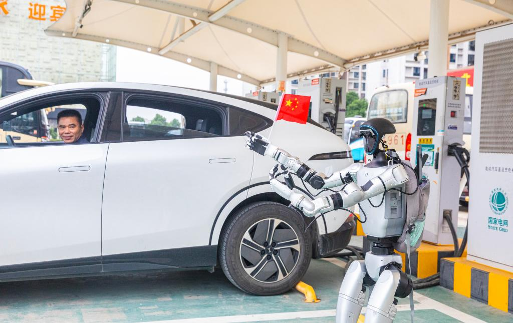 「来,招个手!」 在湖北省黄石市迎宾大道上的一座充电站,不少新能源车主正围住一台人形机器人进行互动。根据引导,这台机器人前行两步、挥舞国旗,引得众人赶紧拍照记录。
