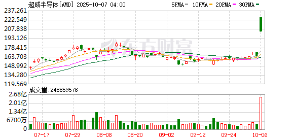 AMD 收盘大涨 23.71%,盘中一度涨超 36%。消息面上,OpenAI 在其官网表示,与 AMD 达成一项战略合作。OpenAI 将部署 6 吉瓦 AMD GPU 算力,使用 AMD Instinct 系列 GPU 为其下一代人工智能基础设施提供动力支持。