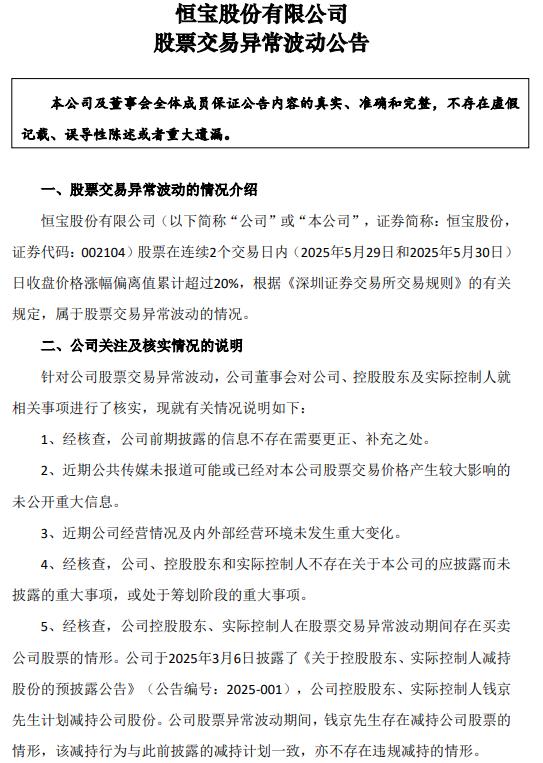 恒宝股份发布异动公告,公司控股股东、实际控制人在股票交易异常波动期间存在买卖公司股票的情形。公司于2025年3月6日披露了《关于控股股东、实际控制人减持股份的预披露公告》,公司控股股东、实际控制人钱京计 ...