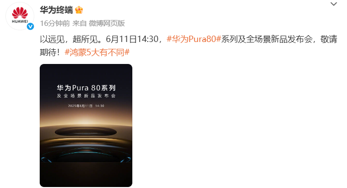 预告。 据华为终端消息,华为Pura 80系列及全场景新品发布会将于6月11日14:30举办,届时将正式发布华为Pura 80系列新机。 上述配文还称:“鸿蒙5大有不同。” 据了解,今年3月20日,在华为Pura先锋盛典 ...