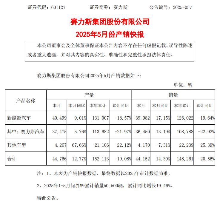 赛力斯6月3日公告,赛力斯汽车5月销量36450辆,同比增长13.19%。1-5月累计销量108788辆,同比减少22.92%。
