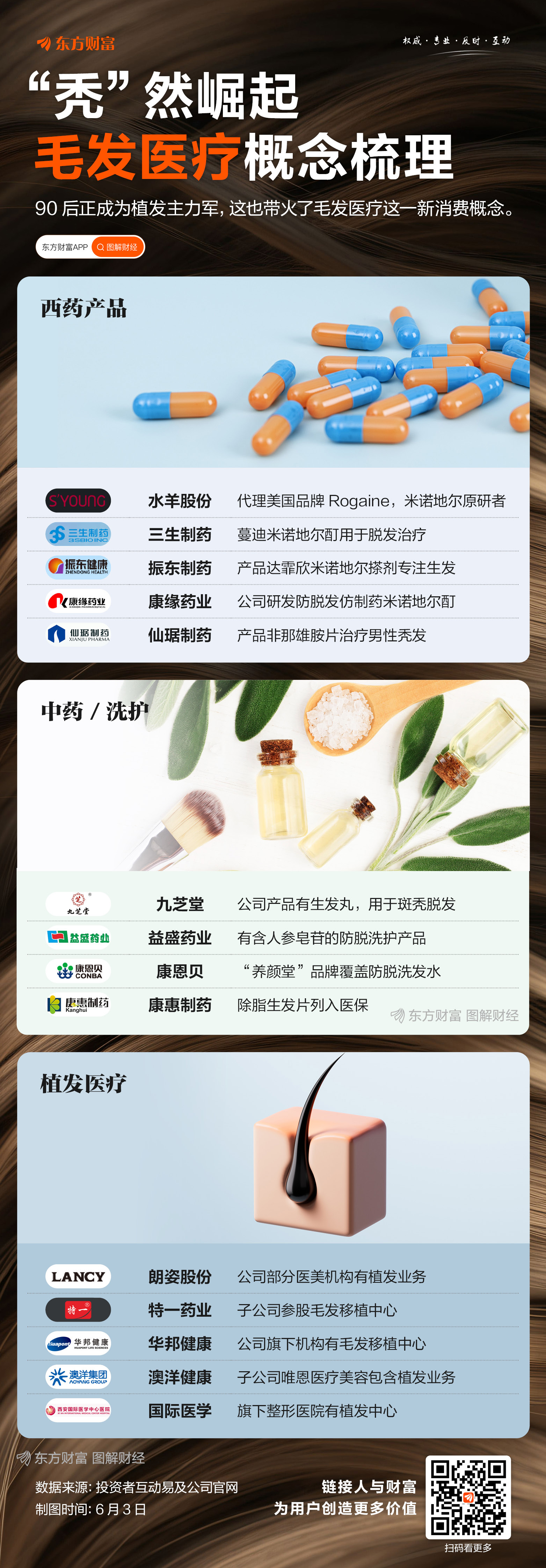新消费概念进一步扩散!周二(6月3日)毛发医疗概念大涨,水羊股份涨超12%,朗姿股份、九芝堂等涨停,振东制药、康缘药业等跟涨。 据澎湃新闻,国家卫健委发布的数据显示,我国脱发人群已超2.5亿,平均每6人中 ...