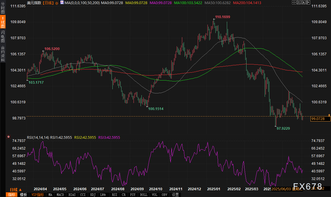 周二(6月3日),美元指数在低位区间内窄幅震荡。近期美元走势受到多重因素交织影响,市场对美国经济前景、贸易政策不确定性以及美联储货币政策预期的关注度持续升温。特朗普关税言论引发的避险情绪一度推高美元, ...