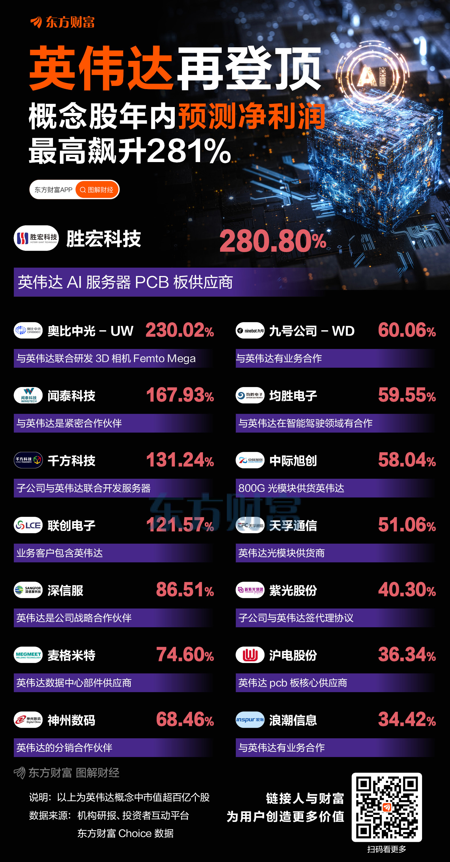 ![]() 受益英伟达市值重返全球第一影响,周三A股算力硬件方向强势,英伟概念活跃,千亿巨头中际旭创大涨超6%,和林微纳涨超7%,景旺电子、麦格米特等跟涨。 美东时间6月3日周二,美股收高,AI硬件“总龙头”英伟达股价上涨近3%,至141.22美元,重新推动该公司市值升至全球第一。 截至周二收盘,在“三万亿美元市值”俱乐部中,英伟达市值为3.4458万亿美元,略微超过微软周二收盘时的市值3.4410万亿美元,而苹果自年初以来涨势相对疲软,市值约为3.04万亿美元。 英伟达此前公布的第一财季报告显示,公司第一财季营收为440.6亿美元,同比增长69%,高于市场预期的433亿美元,净利润则达到了188亿美元,同比增长26%。 尽管面临特朗普政府的种种政策不利性因素,但英伟达的业绩仍然实现了持续增长,这扫清了不少投资者的担忧。 作为英伟达的核心增长引擎,数据中心业务在第一财季实现391亿美元营收,同比增长73%,占总营收比例接近90%。这一增长主要得益于全球对AI基础设施的持续需求,英伟达最新的Blackwell架构产品颇为畅销。英伟达首席财务官Colette Kress表示,在本季度,Blackwell占数据中心收入的近70%,从Hopper的过渡已经基本完成。 硬件总龙头英伟达重返全球市值第一宝座,也映射到了A股,提振了A股相关概念股的情绪风偏。 东方财富Choice数据显示,截止发稿,根据机构一致预测2025年净利润数据,在英伟达概念的百亿市值公司中,供货英伟PCB板的胜宏科技排名第一,2025年预测净利润增长率高达281%;奥比中光排名第二,2025年预测净利润增长率也超过了200%。 接下来排名第三、四、五位的是闻泰科技、千方科技、联创电子三只个股,2025年预测净利润增长率均超过了100%。 深信服、麦格米特、神州数码、九号公司-WD、均胜电子、中际旭创、天孚通信等个股2025年预测净利润增长率则均超过50%,但小于100%。 (文章来源:东方财富研究中心) |