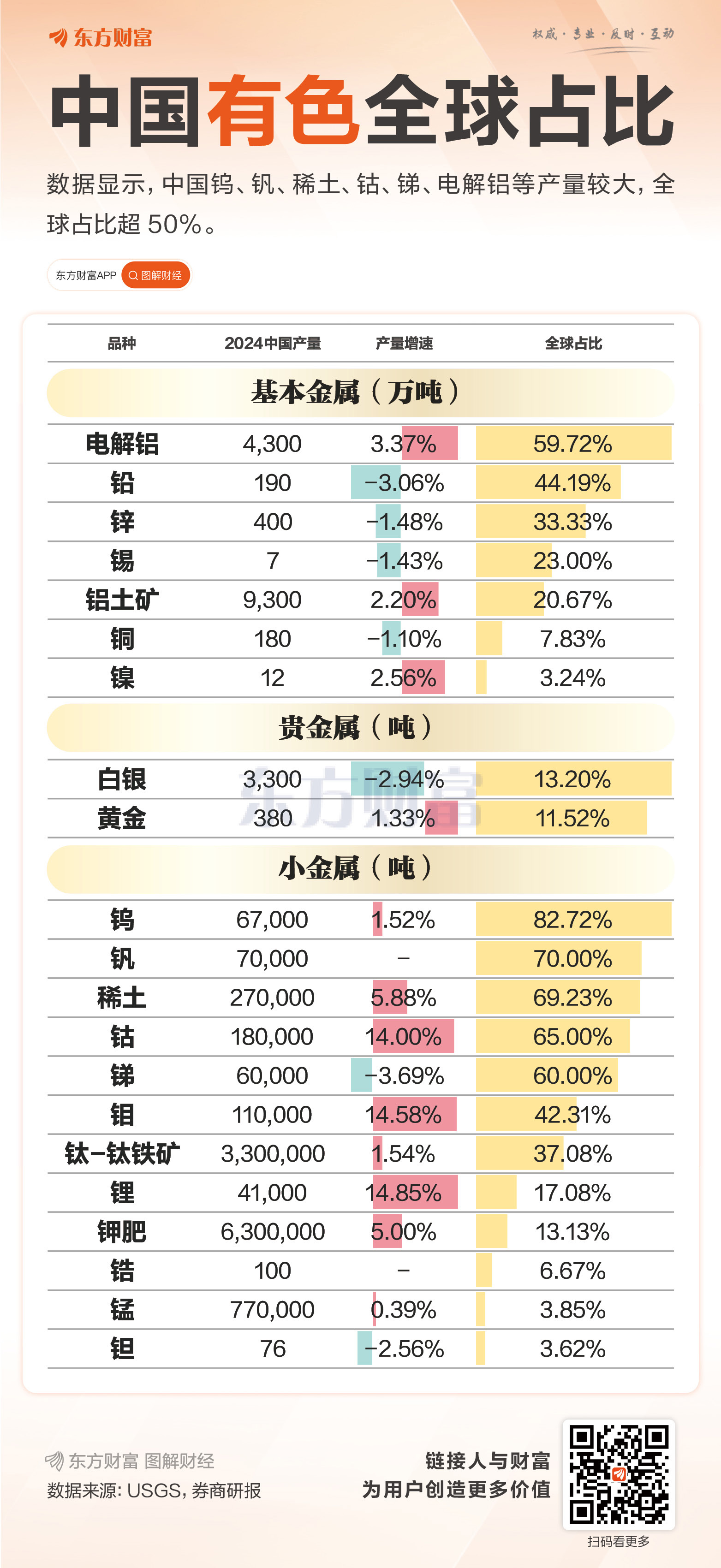 ![]() 周三,稀土板块大涨3.52%,引发市场关注。据USGS(美国地质调查局)公布的2024年全球有色金属产量统计报告,中国2024年的稀土产量占据了全球的69.23%,在国际市场上占据了相当的话语权。 中信证券指出,随着全球新能源汽车、风电等领域的快速发展,对稀土永磁材料的需求将持续增长。稀土板块有望受益于行业需求的扩张,同时,在国家对稀土资源的严格管控下,价格有望保持相对稳定,为板块内企业提供良好的盈利环境。 数据显示,除了稀土外,中国在钨、钒、钴、锑等领域也占据了主导地位,产量在全球的占比均超过50%。其中占比最高的是钨,达82.72%,产业链优势显著。基本金属方面中国也有一定的优势。中国是电解铝第一大生产国,2024年产量占到全球的59.72%,在铅、锌方面的占比也均超过30%。 中国对外依存度较高的有色金属之一是铜。中国的铜矿资源虽然储量不少,但存在着规模小、品位低、成分复杂、开采难度大、成本高等问题,导致铜矿的产能有限,无法满足国内的巨大需求。2024年中国铜产量为180万吨,在全球产量中占比7.83%。 (文章来源:东方财富研究中心) |