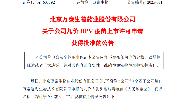 国产九价HPV疫苗要来了! 6月4日晚间,万泰生物(603392)公告称,近日,全资子公司厦门万泰沧海生物技术有限公司申报的九价人乳头瘤病毒疫苗(大肠埃希菌)(商品名称:馨可宁9)获批上市。 ![]() 值得一提的是,馨可宁9为我国第一款、全球第二款九价HPV疫苗,打破国外产品长达十余年的市场垄断。标志着我国正式成为继美国后第二个具有独立自主供应高价次HPV疫苗能力的国家。截至2025年5月,万泰生物九价HPV疫苗累计已完成研发投入约10亿元(未经审计)。 宫颈癌是女性最常见的恶性肿瘤之一,由高危型HPV持续感染引起。过去三十年间,我国宫颈癌发病率与死亡率持续攀升,且呈现明显年轻化趋势。截至目前,我国3亿9—45岁女性中,未接种HPV疫苗的比例高达70%—80%。 宫颈癌也是目前唯一可有效预防的癌症,最有效和经济的预防方式就是接种HPV疫苗。2022年,世界卫生组织正式提出“加速消除宫颈癌全球战略”,我国也提出《加速消除宫颈癌行动计划》,并将“促进HPV疫苗接种”列为行动主要目标之一。 此前,全球范围内仅有一款九价HPV疫苗上市,为默沙东的佳达修®9。佳达修®9于2018年在中国获批,佳达修®9适用9—45岁女性,其中9—14岁可采用二剂次接种程序(0,6—12月),15—45岁采用三剂次接种程序(0,2月,6月)。 此次获批的九价HPV疫苗馨可宁9,覆盖HPV16/18/31/33/45/52/58七种高危型和HPV6/11两种低危型,可预防上述型别人乳头瘤病毒感染引起的相关疾病。适用于9—45岁女性,其中9—17岁可采用二剂次接种程序(0,6月),18—45岁采用三剂次接种程序(0,1月,6月)。 据悉,馨可宁9是万泰疫苗和厦门大学国家传染病诊断试剂与疫苗工程技术研究中心(NIDVD)联合研制。此前,双方紧密合作,研发并上市了多款创新型疫苗。其中,2019年,双方经过18年的科研攻关,研制出了具有完全自主知识产权的首个国产双价人乳头瘤病毒疫苗(大肠杆菌)——馨可宁®(Cecolin®)(简称“二价疫苗”),使我国成为世界上第三个可以自主供应HPV疫苗的国家。 另一则公告显示,馨可宁9生产车间生产线已通过GMP符合性检查。万泰生物表示,这表明公司产品生产质量管理符合GMP要求,将有利于公司继续保持稳定的产品质量和持续稳定的生产能力。截至2025年5月,公司九价HPV疫苗累计已完成研发投入约10亿元。 公开数据显示,作为全球范围内仅有一款九价HPV疫苗生产商,默沙东HPV疫苗产品2024年全年销售额为85.83亿美元。另据默沙东佳达修®9国内代理商智飞生物公开年报数据显示,2024年,默沙东的佳达修®9的批签发量约3114万剂。 万泰生物表示,九价HPV疫苗上市许可申请获得批准,将有利于公司HPV疫苗的推广和使用,丰富公司产品线,进一步增强公司的核心竞争力,为公司持续稳健发展奠定坚实基础。公司本次通过GMP符合性检查,表明公司产品生产质量管理符合GMP要求,将有利于公司继续保持稳定的产品质量和持续稳定的生产能力,以满足相关产品的市场需求。 (文章来源:证券时报网) |