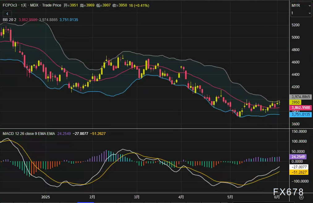 周三 6月4日 马来西亚衍生品交易所 BMD 棕榈油期货周三盘中探底回升 主力合约FCPOc3最终收报3950林吉特 吨 较前日上涨16林吉特 0 41 技术面显示 日线布林通道中轨位于3863林吉特 MACD柱状线虽仍处于负值区 ...