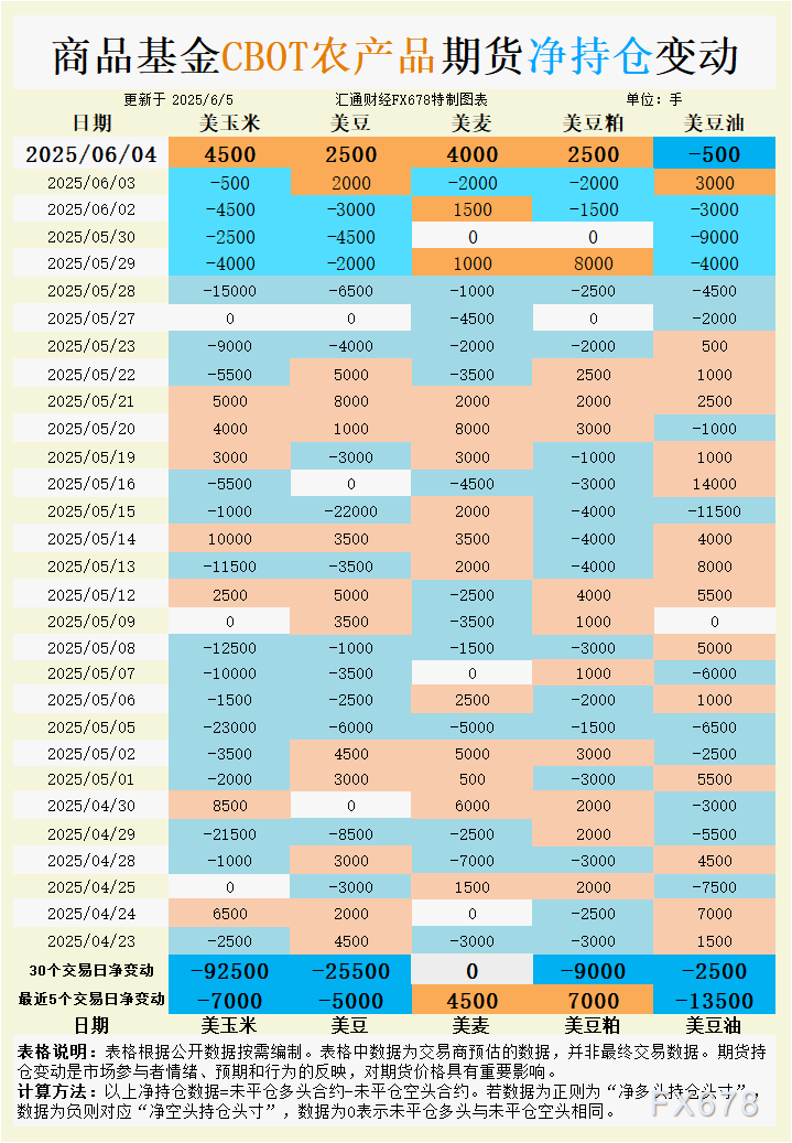 CBOT谷物期货市场呈现分化走势。美小麦期货上涨0.46%,报5.45美元/蒲式耳,受到俄乌局势升级和小麦产区干旱威胁的支撑;美玉米上涨0.34%,报4.39-3/4美元/蒲式耳,市场情绪谨慎但受技术性买盘提振;美大豆小幅上涨0.07%,报10.44-1/2美元/蒲式耳,逢低买盘活跃但受美豆种植进展顺利压制;美豆粕上涨0.13%,而美豆油下跌0.26%,反映油脂市场情绪偏弱。 ![]() 6月4日,CBOT小麦期货净多头持仓增加4000手,过去5个交易日净多头累积4500手,显示基金对小麦价格的看涨情绪有所回暖。然而,过去30个交易日净持仓为零,表明多空博弈激烈,市场对小麦价格方向尚未形成一致预期。持仓增加反映了市场对俄乌局势升级和干旱天气的担忧。俄乌局势加剧了黑海地区小麦供应不确定性,乌克兰谷物生产商联盟预计6月玉米出口量降至100万吨,较5月减半,间接推升全球粮食供应紧张预期。 基本面看,俄乌局势和干旱是当前小麦市场的核心驱动因素。俄乌局势升级促使市场重新评估黑海地区小麦出口稳定性,尽管直接数据暂未显示小麦出口大幅下滑,但地缘风险溢价已体现在价格中。基差方面,6月装船的美国小麦FOB出口溢价稳定,反映美国小麦在全球市场竞争力增强,部分原因是巴西农户转向销售玉米,减轻了对美豆的竞争压力。 短期内,小麦期货价格可能在5.40-5.60美元/蒲式耳区间波动,地缘风险和天气问题将继续支撑价格,但美国中西部良好种植天气可能限制上行空间。未来需关注USDA周度出口销售数据(预计2024/25年度为-20万至10万吨,2025/26年度为30万至80万吨)以及干旱对产量的实际影响。 玉米:供应宽松与技术性买盘博弈 6月4日,CBOT玉米净多头持仓增加4500手,但过去5个交易日净空头增加7000手,30个交易日净空头累积92500手,显示基金整体对玉米价格偏谨慎。近期持仓转向净多头,反映技术性买盘和逢低买盘活跃,但长期空头持仓主导表明市场对供应宽松的预期占上风。交易商数据显示,6月4日基金净买入玉米期货,支撑了当天0.34%的涨幅。 美国中西部天气良好,玉米种植进度顺利,USDA预计2024/25年度玉米出口销售为77.5万至140万吨,显示需求稳定但无显著利多。巴西玉米出口预计6月仅为83.57万吨,低于去年同期,反映南美供应竞争力下降,这为美玉米出口提供了空间。基差方面,6月装船的CIF玉米驳船报价为66美分/蒲式耳,FOB出口溢价稳定在78美分/蒲式耳,显示美国玉米在全球市场竞争力增强。然而,全球玉米供应宽松的格局限制了价格上行空间。 玉米期货短期可能在4.30-4.50美元/蒲式耳区间震荡,技术性买盘提供支撑,但供应宽松和种植进度顺利将继续施压。中期需关注6月底USDA种植面积报告,若面积下调或天气出现异常,可能触发反弹。 大豆:逢低买盘与出口预期分化 6月4日,CBOT大豆净多头持仓增加2500手,但过去5个交易日净空头增加5000手,30个交易日净空头累积25500手,显示市场情绪偏空但短期有回暖迹象。交易商报告称,6月4日基金净买入2500手大豆期货,推动当天价格小幅上涨0.07%。逢低买盘和技术性买盘活跃,但USDA5月供需报告奠定的偏紧基调尚未完全扭转市场对供应宽松的预期。 USDA预测2025/26年度全球大豆增产放缓,类似15/16和17/18年度的供需格局,奠定区间波动的基调。巴西6月大豆出口预计为1255万吨,低于5月的1420万吨,显示南美供应节奏放缓。美国大豆因巴西农户转向玉米销售而竞争力增强,6月CIF大豆驳船报价升至69美分/蒲式耳,FOB出口溢价为78美分/蒲式耳,反映出口需求回暖。然而,特朗普关税言论引发市场对中美贸易谈判的担忧,可能影响美豆出口前景。 大豆期货短期可能在10.30-10.60美元/蒲式耳区间运行,逢低买盘和技术性支撑限制下行空间,但宏观不确定性和供应宽松预期将抑制涨幅。关注USDA周度出口销售数据(预计2024/25年度为10万至50万吨)及6月面积报告。 豆粕:震荡寻底与供应趋紧预期 6月4日,CBOT豆粕净多头持仓增加2500手,过去5个交易日净多头累积7000手,显示基金对豆粕价格的看涨情绪升温。然而,30个交易日净空头增加9000手,反映长期看空情绪仍占主导。交易商报告称,6月4日基金净买入豆粕期货,支撑了0.13%的涨幅。市场对9月后国内大豆供应趋紧的预期推升了豆粕价格的支撑力度。 五矿期货分析指出,2025/26年度美豆供需偏紧,但全球大豆增产放缓,类似18/19年度的供需格局,豆粕价格可能震荡寻底。巴西6月豆粕出口预计为129万吨,低于去年同期,显示南美供应节奏放缓。美国豆粕出口预期稳定(2024/25年度为20万至50万吨),但若9月后中美贸易谈判无进展,国内大豆供应可能趋紧,支撑豆粕价格。基差数据暂缺,但现货市场显示需求平稳。 豆粕期货短期可能在低位震荡,区间为350-370美元/短吨,9月后若供应趋紧预期升温,价格可能反弹。关注USDA出口销售数据及中美贸易谈判进展。 豆油:棕榈油竞争与需求疲软承压 6月4日,CBOT豆油净空头持仓增加500手,过去5个交易日净空头累积13500手,30个交易日净空头增加2500手,显示基金对豆油价格持续看空。交易商报告称,6月4日基金净卖出豆油期货,价格下跌0.26%,反映市场对油脂需求疲软的担忧。 马来西亚棕榈油出口强劲,5月出口量环比增长17.9%至130万吨,价格优势吸引印度买家,压制美豆油价格。国家粮油信息中心指出,美国国内棕榈油需求下降,进口意愿低迷,进一步拖累豆油价格。美国豆油出口预期偏弱(2024/25年度为0.5万至2.5万吨),而中西部良好种植进度预