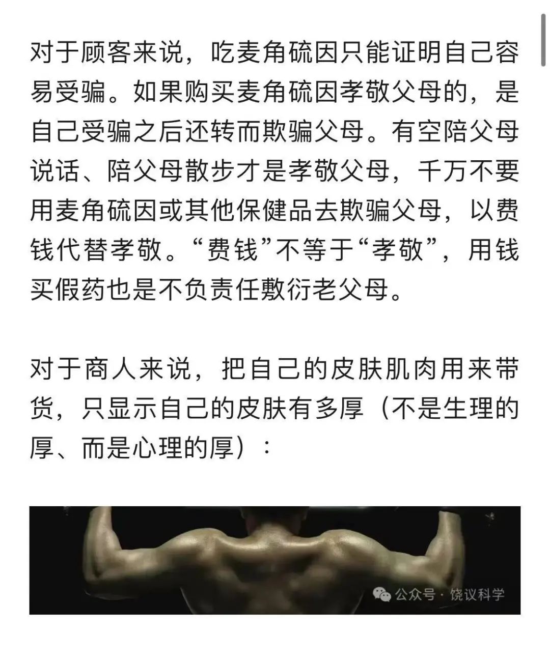 前不久75岁科伦药业董事长刘革新公开秀肌肉代言的“麦角硫因”竟被生物学家公开批驳是“假药”。对此,科伦药业最新回应:不便置评他人言论。 6月5日下午,前首都医科大学校长饶毅在其个人公众号“饶议科学”公开发文指出,凡是没有足够令人信服的证据,不能获得批准成为真药,是假药的,只好以保健品方式蒙人、骗人。麦角硫因就是“假药”。 ![]() 前不久,饶毅在和协和医学院校长王辰一同给“科学探索奖-医学奖”获得者颁奖时的发言曾引发舆论广泛关注。 与此同时,上月(2025年5月)科伦药业一则广告视频曾“火出圈”,在该则视频中,75岁的科伦药业董事长刘革新脱下外套,露出了身上紧实的肌肉,并称其长期服用麦角硫因,亲自为其公司的麦角硫因胶囊代言,1499元60粒,产品将会先行在日本上市。 上述消息传开后,A股麦角硫因概念异军突起,丽人丽妆、川宁生物、拓新药业、金达威、福瑞达等多只个股曾一度大涨。 如今,在最新发文中,饶毅说:“曾经长期有各种电线杆(实际的电线杆和比喻的电线杆),张贴各种欺骗信息,号称可以帮忙某些男子,直到真正的科学研究发现伟哥,假药基本没了,让位于真药。” “所以有证据提交给药监部门,伟哥获得各国监管部门的批准,畅销全球。如果它(麦角硫因)确实能够对动物或人有延年益寿的作用,早就会有人提供足够证据获得药监部门批准。因为缺乏证据,得不到批准,销售商才走保健品的路子。”饶毅说。 ![]() 饶毅表示,商人与企业家有天壤之别。企业家需要做出真东西来,商人只要能够推销就可以。“大肆推广麦角硫因,就是说商人不顾廉耻进行蒙人的一个例子。” 饶毅还进一步表示,对于顾客来说,吃麦角硫因只能证明自己容易受骗。如果购买麦角硫因孝敬父母的,是自己受骗之后还转而欺骗父母。有空陪父母说话、陪父母散步才是孝敬父母,千万不要用麦角硫因或其他保健品去欺骗父母,以费钱代替孝敬。“费钱”不等于“孝敬”,用钱买假药也是不负责任敷衍老父母。 ![]() 对此,6月5日下午,科伦药业证券部工作人员对以投资者身份致电的媒体记者回应称,“我们没有关注到(该公众号文章内容)。对于其他人的评论,我们也不方便做公开评论,取决于您自己通过各方面综合信息的判断。” 公开资料显示,饶毅,男,1962年出生于江西省南昌市,生物学家,中国医学科学院学术咨询委员会学部委员、北京大学终身讲席教授、首都医科大学教授等。 1991—1994年,饶毅在哈佛大学的生物化学和分子生物学系从事博士后研究工作。2004年,饶毅任美国西北大学神经科学研究所副所长;2007年,饶毅回国受聘出任北京大学讲席教授、生命科学学院院长;2019年6月,饶毅任首都医科大学校长;2025年3月,饶毅卸任首都医科大学党委副书记、校长。 据此前媒体报道,麦角硫因是1909年在真菌Claviceps purpurea中被发现的一种稀有天然氨基酸,被认为是地表“最强抗氧化剂”。麦角硫因作为能高效进入线粒体和细胞核的长效天然抗氧化剂,人体不能自主合成。通过生物合成的方式,其在食品、化妆品、功能食品和生物医药等行业都具有广阔的应用前景。 (文章来源:证券时报网) |