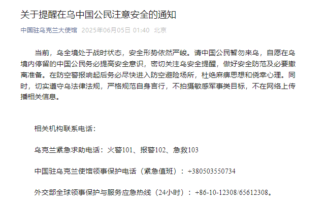 据央视新闻,当地时间6月6日,乌克兰基辅市传出爆炸声。此前乌克兰全境已拉响防空警报。 ![]() 图片来源:央视新闻 “双方打一会儿再介入” 特朗普称短时间难以促成俄乌立即停火 美国总统特朗普5日在白宫会见到访的德国总理默茨时说,在短时间内促成俄罗斯和乌克兰立即达成停火比较困难。 特朗普在会见中多次强调,俄乌双方当前积怨和敌意很深,加之俄方已明确表示将对乌袭击俄战略空军基地展开强硬反击,因此在短时间内促成双方立即达成停火比较困难。特朗普还把自己比作冰球比赛中的裁判,遇到场上斗殴时,会让双方队员扭打一会儿再介入。 默茨在会见中称特朗普是停止俄乌冲突的“关键人物”,同时要求特朗普对俄施加更多压力。 ![]() 默茨(左)特朗普(右) 图片来源:央视新闻 美国媒体报道说,特朗普在会见时三次被媒体问及是否会对俄实施新的制裁,或者是否支持美国会通过新的对俄制裁法案。特朗普未作明确表态,仅表示会与默茨展开相关讨论,并暗示近期不会有任何动作。 特朗普暗示可能会同时制裁俄乌双方,因为“一个巴掌拍不响”,“当我看到事情无法停止的时候,我们会非常强硬,而且可能对两个国家都如此”。 美国阿克西奥斯新闻网站5日在会见后发表的评论中说,特朗普的言论再次表明,“他认为俄乌尚未准备好实现和平,他正考虑从说服双方实现和平的最初立场上后退”。 俄罗斯指责英法为乌袭击俄境内机场提供支持 据央视新闻,乌克兰方面6月1日称,出动117架无人机对俄多个州的机场实施了袭击,俄军的战略轰炸机是袭击目标。当地时间5日,俄罗斯官员指责英法两国为乌克兰的相关袭击提供了情报和技术支持。乌克兰外交部则表示,对俄境内军事目标的打击是正当防卫手段。 当地时间6月5日,俄罗斯联邦委员会副主席康斯坦丁·科萨切夫在接受俄媒采访时表示,乌克兰在袭击俄罗斯军用机场的过程中利用了英国和法国的情报信息。俄罗斯驻英国大使安德烈·克林5日在接受英国媒体采访时表示,乌方的袭击可能导致冲突升级,他指责英国向乌方提供技术支持。他说,乌方不可能单独完成这类袭击,而相关技术只有英美等极少数国家拥有。美方已经明确否认了向乌克兰提供技术支持,而英国方面对此至今都没有否认。 乌克兰外交部6月5日发表声明称,乌方对俄境内军事目标实施打击,是保护平民免受俄罗斯导弹和无人机袭击的正当防卫手段。声明称,这些战机之所以成为打击目标,正是因为它们准备对乌克兰发动新一轮袭击。乌克兰外交部称,乌克兰始终严格遵守国际人道主义法,仅针对合法军事目标实施打击并竭力避免平民伤亡。 中国驻乌克兰大使馆通知:中国公民做好撤离准备 中国驻乌克兰大使馆6月5日发布通知: 当前,乌全境处于战时状态,安全形势依然严峻。请中国公民暂勿来乌,自愿在乌境内停留的中国公民务必提高安全意识,密切关注乌安全提醒,做好安全防范及必要撤离准备。在防空警报响起后务必尽快进入防空避险场所,杜绝麻痹思想和侥幸心理。同时,切实遵守乌法律法规,严格规范自身言行,不拍摄敏感军事类目标,不在网络上传播相关信息。 ![]() 图片来源:中国驻乌克兰大使馆官微 (文章来源:每日经济新闻) |