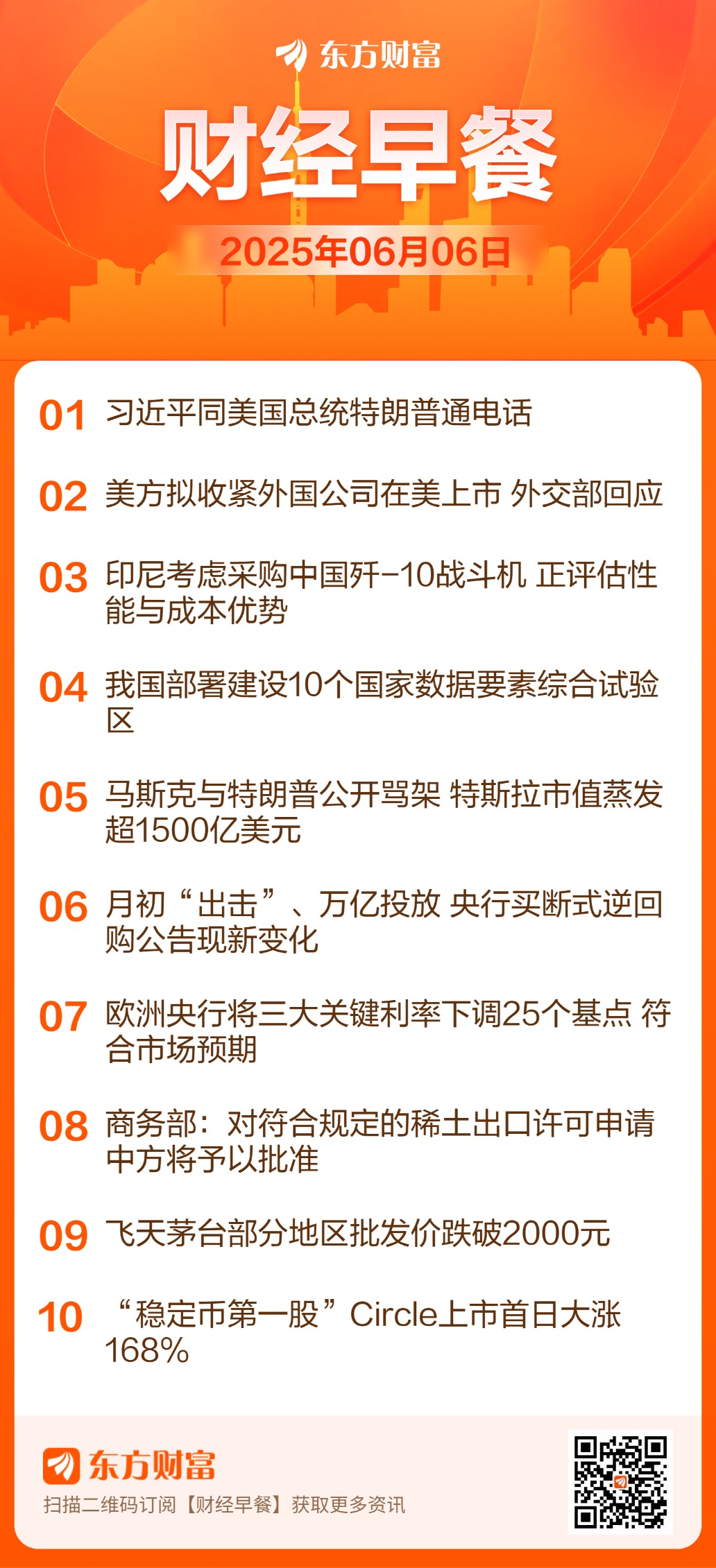 ![]() 每日精选中美关系: 6月5日晚,国家主席习近平应约同美国总统特朗普通电话。 习近平指出,校正中美关系这艘大船的航向,需要我们把好舵、定好向,尤其是排除各种干扰甚至破坏,这尤为重要。根据美方提议,两国经贸牵头人在日内瓦举行会谈,迈出了通过对话协商解决经贸问题的重要一步,受到两国各界和国际社会普遍欢迎,也证明对话和合作是唯一正确的选择。双方要用好已经建立的经贸磋商机制,秉持平等态度,尊重各自关切,争取双赢结果。对此,中方是有诚意的,同时也是有原则的。 中美经贸: 国家副主席韩正在北京会见中美高级别二轨对话美方代表团。韩正表示,希望中美高级别二轨对话能不断汇聚两国有识之士的真知灼见,增进美国各界对中国的了解和理解,共同推动中美关系稳定、健康、可持续发展。美方表示,美中高级别二轨对话有助于双方更好理解对方,为两国关系发展提供更多有益思路。中国经济发展令人钦佩,双方应加强贸易、投资等领域对话合作。 马斯克与特朗普公开骂架: 当地时间6月5日,受特斯拉首席执行官马斯克与美国总统特朗普矛盾公开化影响,当日特斯拉股价下跌14.26%。据美国有线电视新闻网(CNN)报道,特斯拉市值蒸发超过1500亿美元。 美股IPO收紧: 有记者就美国拟收紧外国公司在美上市一事提问。对此,外交部新闻发言人表示,美方应恪守公平竞争的市场原则,停止将经贸问题政治化,为包括中国企业在内的各国企业提供公平、公正、非歧视的营商环境。中方将采取必要手段,坚决维护中国企业的正当合法权益。 商务部发布会: 有记者就美方对华采取新限制措施进行提问。对此,商务部发言人表示,美方在日内瓦会谈后,对华采取一系列限制措施,严重破坏既有共识,严重损害中方正当权益。中方对此强烈不满、坚决反对,要求美方立即停止。如果美方一意孤行,继续损害中方利益,中方将坚决采取有力措施,维护自身正当权益。 美国贸易代表办公室日前宣布延长对中国在技术转让、知识产权和创新方面的行为、政策及做法的301调查的豁免期限。对此,商务部发言人表示,敦促美方彻底取消包括301关税在内的各种对华限制措施,与中方共同维护日内瓦经贸会谈共识精神,推动中美经贸关系健康、稳定、可持续发展。 美国将进口的钢铝以及其衍生品关税从25%提高到50%,政策已经正式生效。对此,商务部发言人表示,中方敦促美方,尊重经济规律,摒弃零和思维,停止泛化和滥用国家安全概念,与各方一道维护以规则为基础的多边贸易体制,通过平等对话解决各自关切,共同维护全球产业链供应链稳定。 国内货币政策: 央行发布公告称,将在6月6日以固定数量、利率招标、多重价位中标方式开展10000亿元买断式逆回购操作,期限为3个月(91天),这也是央行首次在月初公开开展买断式逆回购操作。鉴于6月将有5000亿元3个月期和7000亿元6个月期买断式逆回购到期,本次买断式逆回购操作将有力对冲当月较大额度的买断式逆回购到期资金。 欧洲降息: 欧洲央行将存款利率下调至2.0%,将边际贷款利率下调至2.40%,将主要再融资利率下调至2.15%,均符合市场预期。这是欧洲央行2024年6月以来的第八次降息。交易员增加对欧洲央行降息的预期,预计今年还将再降33个基点。 科技金融: 证监会首席律师程合红在2025天津五大道金融论坛上表示,证监会将深化资本市场科技金融体制机制改革,充分发挥多层次资本市场功能作用,不断推动科技创新和产业创新深度融合,切实加强对投资者特别是中小投资者合法权益的保护,更大力度支持服务科技创新和新质生产力发展。 金融监管总局副局长周亮在2025天津五大道金融论坛上表示,金融监管总局全力推动金融机构聚焦金融服务科技创新的短板弱项,完善金融支持创新体系,推动金融发展更好适应新时代科技创新需求。总局正在研究制定科技保险相关政策,更好发挥保险业风险补偿、风险减量、资金杠杆作用。 兵装重组: 汽车央企重组大戏出现了新变化。“东风系”和“兵装系”上市公司发布公告,分别披露了控股股东重组进展情况。其中,东风公司暂不涉及相关资产和业务重组。经国务院批准,对兵器装备集团实施分立,其汽车业务分立为一家独立中央企业,由国务院国资委履行出资人职责。 热点题材稀土: 商务部新闻发言人在例行记者会上表示,稀土等相关物项具有明显的军民两用属性,对其实施出口管制是国际通行做法。中国政府依法依规对两用物项相关出口许可申请进行审查,对符合规定的申请,中方将予以批准,促进便利合规贸易。 数据要素: 据国家数据局,我国将在北京、浙江、安徽等地部署建设10个国家数据要素综合试验区,支持各地在培育经营主体、繁荣壮大数据市场等方面开展先行先试,全面释放实体经济和数字经济融合效能。 军工: 据印尼军方消息,印尼政府正就采购中国制造的歼-10战斗机进行可行性评估。印尼国防部副部长道凡托表示,此举旨在提升印尼空军的现代化作战能力,同时兼顾国防预算的性价比。 稳定币: 当地时间6月5日,稳定币“第一股”Circle美国IPO首日收涨168.48%。Circle公司发行价每股31美元。远高于本周预期的27至28美元区间,使其在周四开盘前的估值达到约68亿美元。Circle公司本次IPO共筹资近11亿美元。 航空发动机: 湖南省株洲市举办的AES100发动机研制工作总结会宣布,AES100