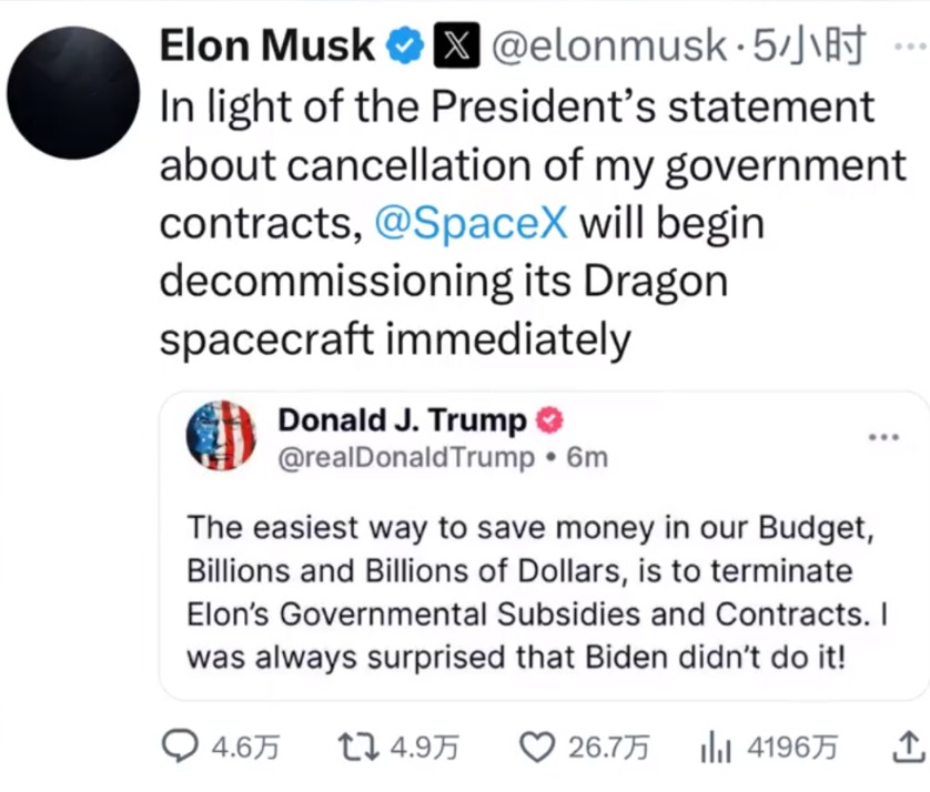据央视新闻6月6日消息,当地时间6月5日,马斯克表示,SpaceX不会让“龙”飞船退役。 几个小时前,他曾表示,鉴于美国总统特朗普关于取消政府合同的声明,SpaceX将开始退役“龙”飞船。 ![]() ![]() 图片来源:CCTV国际时讯微博 当地时间6月5日,美国太空探索技术公司(SpaceX)创始人马斯克表示,鉴于特朗普关于取消政府合同的声明,美国太空探索技术公司将立即开始退役其“龙”飞船。 据了解,当前美国的载人航天活动极大依赖美国太空探索技术公司的“龙”飞船。 据央视新闻,6月5日稍早时,特朗普在其社交媒体平台“真实社交”上发文称,埃隆·马斯克已开始“失去耐性”。特朗普称他要求马斯克离开,撤销了马斯克强推的电动汽车“强制令”,结果“马斯克疯了”。 特朗普声称,马斯克几个月前就知道特朗普会撤销电动汽车“强制令”。此外,特朗普还对马斯克发出威胁,他表示,在数十亿美元的预算中,最简单的省钱方法就是终止埃隆·马斯克的政府补贴和合同。 从2024年7月马斯克公开支持特朗普到关系破裂,不到一年的时间,两人就因为一项被冠名“大而美”的法案,走向彻底反目。 5月22日,共和党议员占多数的美国国会众议院以微弱优势通过了特朗普政府提出的一项大规模税收与支出法案。特朗普政府将该法案描述为“大而美”。法案内容总体可概括为两个方面: 一是,削减税收、医疗补助、食品援助、教育和清洁能源支出,并将以此途径节约出的资金用于军事与边境安全; 二是,提高债务上限,允许联邦政府继续借款为债务融资。 由此,多家美国媒体预计,该项法案将招致巨大后果,总体而言也是两方面: 一是,联邦政府赤字大幅增加; 二是,没有生活保障的人数将激增。 也是基于这两种后果,有反对该法案的美国政界人士表示,该项法案是在“劫贫济富”。 美国民主党籍参议员克里斯·墨菲认为,这项法案是以上千万美国人的医保为代价,“给最富有的1%群体再送上万亿美元减税大礼”。就连一些共和党议员都因质疑该法案是在“开具无法兑现的支票”而表示反对。 ![]() 图片来源:央视新闻 至于该法案被反对的另一大理由,则是美国联邦政府的财政赤字将必然扩大。 美国国会预算办公室6月4日公布的预估数据显示,该法案将使36.2万亿美元的美国债务再增加约2.4万亿美元。 美国无党派机构“负责任联邦预算委员会”6月3日公布的预测数据则更加惊人,如果将利息支出考虑在内,该法案所招致的债务在十年内可能会上升到3万亿美元,如果临时减税政策永久化,则债务成本将上升到5万亿美元。 据分析,马斯克强烈反对该法案的原因也在于此。 5月30日,是马斯克作为“政府效率部”负责人的最后一天。在过去三个月,马斯克所实现的减少美国政府财政支出额不到2000亿美元,与其最初预期的减少1万亿美元财政支出目标相差甚远。 而当前的税改法案,将新增大量财政收支缺口,这对美国财政的可持续性构成巨大挑战。马斯克曾在5月27日的一档媒体节目中直言,税改法案削弱了“政府效率部”的工作,也由此开始了他持续不断地对该法案的抨击。 在5月27日,马斯克离开“政府效率部”的前几日,美国哥伦比亚广播公司播出的一档节目中,马斯克第一次发表了其对税改法案的评论。在当时,马斯克的评价还仅仅是“感到失望”。 当时,针对特朗普对该法案“大而美”的表述,马斯克的评价也相对克制,只是说:我认为一项法案可以是‘大’的,也可以是‘漂亮’的,但我不知道它是否能两者兼具。 在哥伦比亚广播公司6月1日发布的采访内容中,马斯克更进一步表达了对美国政府的不满。 马斯克在采访中表示,他不想公开反对美国政府,但也不想为政府所做的一切承担责任。马斯克称,他所领导的“政府效率部”成了一切的“替罪羊”。 ![]() 图片来源:央视新闻视频截图 马斯克在社交媒体平台上发布消息称,这项规模庞大的法案“荒谬”“令人作呕”。马斯克称,该法案将使预算赤字大幅增至2.5万亿美元,使美国公民背负难以承受的债务负担。 不过特朗普政府似乎并不想止步于这次的税改法案,当地时间4日,美国总统特朗普在其社交媒体平台“真实社交”上表示,债务上限应该彻底取消,以防止经济灾难的发生。特朗普称,债务上限“太具破坏性”,不应该被那些想利用它的政客们掌控。 这也是本次马斯克与特朗普持续骂战的焦点——税改法案中包括一条,将债务上限提高4万亿美元。特朗普4日的表态,则表达了想要直接取消债务上限,无限量举债“开源”的意图。 截至6月5日,美国当前的债务总额已超过36万亿美元。美财长贝森特曾在上个月发出预警,美国财政部或将在8月底前耗尽资金,致使美国触及债务上限,若届时无法提高或取消债务上限,美国将发生政府违约的局面。 若特朗普税改法案得以落实,而又无法取消或再提高债务上限,美国政府的债务违约将必然发生,届时将引发新一轮的金融危机。 但相较于未来的美国政府债务违约,当前特朗普与马斯克公开反目已经产生了一个受害者——特斯拉。 6月5日,马斯克与特朗普反目互怼后不久,由马斯克任首席执行官的电动汽车企业特斯拉的市值迅速蒸发了约千亿美元,特斯拉股价当日一度暴跌16%。截至当天收盘,特斯拉股价较开盘时跌去14.26%,市值蒸发超1500亿美元(约合人民币10764亿元)。 特斯拉董事会此前曾在4月30日被曝正在寻