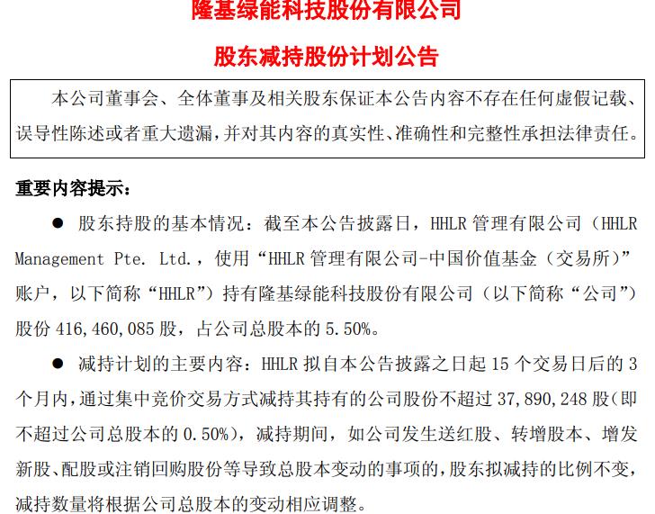 隆基绿能6月6日公告,公司持股5%以上股东HHLR管理有限公司(使用“HHLR管理有限公司-中国价值基金(交易所)”账户)计划自2025年6月30日起至2025年9月29日止,通过集中竞价交易方式减持公司股份不超过3789.02万 ...
