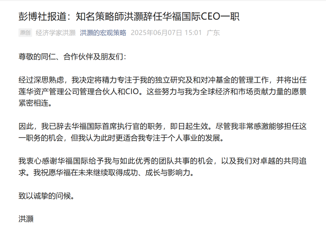 6月7日,知名策略分析师洪灏在个人社交平台官宣辞任华福国际CEO一职,将出任莲华资产管理公司管理合伙人和CIO。洪灏于今年4月15日加盟华福国际。 华福国际向中国基金报表示,公司尊重洪灏先生基于个人职业规 ...