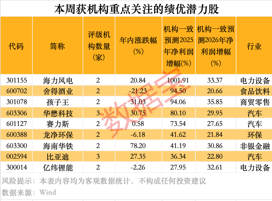本周获机构给予“买入型”评级个股中,大多数属于绩优股。 电子行业本周获机构重点关注 据证券时报·数据宝统计,本周(6月2日至6日),43家机构合计进行186次“买入型”(包括买入、增持、推荐、强烈推荐、强烈买入)评级,合计覆盖156只个股。 从行业分布来看,电子、汽车、机械设备、电力设备等6个行业股票数量均不低于10只,其中电子行业个股数量多达24只。医药生物、食品饮料分别有9只、7只。 从市场表现来看,本周通信、电子、计算机等行业表现均较为领先,行业指数周度涨幅均超过2.5%。中原证券表示,中国经济延续温和复苏态势,消费与投资成为核心驱动力。近期国家落地一揽子货币政策,重点支持科技创新、普惠金融和消费领域,为市场注入流动性信心。 以周度计算,医药生物行业近5周涨幅持续超过1%,是31个申万一级行业中唯一连续5周涨幅超过1%的行业。 近期,国产创新药捷报频传,尤其在出海方面成果显著。根据中泰证券研报,5月20日,三生制药与辉瑞就PD-1/VEGF双特异性抗体达成的12.5亿美元首付款的BD交易,刷新了国产创新药出海的首付款记录,催化了创新药高昂的投资热情。 东吴证券研报指出,根据医药魔方数据,2024年中国创新药院内(等级医院)市场规模超过2500亿元,占国内核心医院市场药品规模的29%,占全球创新药市场的3%左右,预计2030年超过4500亿元。2024年中国创新药院外(零售药房)市场规模超过1000亿元,预计2030年超过2000亿元。 ![]() 23股本周获得2家及以上机构重点关注 本周有23只个股获得2家及以上机构重点关注,关注机构家数居前的个股以汽车、电力设备、非银金融、银行行业为主。5只个股获得3家及以上机构给予“买入型”评级,其中有4只个股来自汽车行业,分别为长安汽车(000625)、长城汽车(601633)、比亚迪(002594)及华懋科技(603306);1只个股为非银金融行业的中国平安。 上述5只个股中,除华懋科技外,其余4只个股的最新市值均超过1000亿元,长安汽车最新市值接近1120亿元。公司近期回复投资者,宁德时代是公司重要的战略合作伙伴,合资公司“时代长安”基于双方技术优势和资源整合能力,共同打造高品质的电池产品,有效保障长安汽车旗下新能源产品不断增长的市场需求。 长城汽车获4家机构给予“买入型”评级,时隔7年(2017年至2023年),公司2024年净利润再次突破百亿元。今年前5个月,公司新能源汽车累计销售12.4万辆。最新的指数调仓中,公司获富时中国A150指数纳入。 比亚迪最新市值超过1.1万亿元。最新产销快报数据显示,今年前5个月,公司新能源汽车累计销售176.34万辆,同比增长38.7%。其中5月份销量38.25万辆,海外销量达8.9万辆。截至目前,比亚迪已进入欧洲30多个国家,海鸥是比亚迪近3年在欧洲推出的第八款纯电车型,彰显了比亚迪进一步深耕欧洲市场的决心。 民生证券表示,看好公司技术驱动产品力与品牌力向上,引领智驾平权,加速出海,同时高端化稳步推进,预计公司2025年至2027年业绩有望持续增长。 电力设备股亿纬锂能(300014)和海力风电(301155)均获得2家机构给予“买入型”评级,其中海力风电本周获国投证券首次关注。 多只食品饮料股获机构给予“买入型”评级,包括舍得酒业、古井贡酒、燕京啤酒、五粮液等。 9股业绩增长潜力大 进一步统计,本周获机构给予“买入型”评级的个股,最显著的特征为业绩成长性优质。本周获机构重点关注的23只个股中,机构一致预测2025年、2026年净利润增幅有望持续超过20%的个股仅有9只,主要分布在汽车、电力设备、商贸零售、食品饮料等行业。 按照业绩成长性排序,机构一致预测2025年净利润增幅居前的有海力风电、舍得酒业、孩子王(301078)。其中海力风电2024年扭亏为盈,华安证券、光大证券一致认为国内海风建设有望加速,国内海风装机或提速发展,为公司业绩带来较强的改善动力,公司盈利能力有望进一步提升。机构一致预测公司2025年净利润增幅有望超过10倍。 孩子王获机构一致预测2025年净利润增幅有望超过90%,华龙证券表示,公司围绕“三扩”战略以及“复购、加盟、同城数字化”,持续推进门店场景升级及供应链体系优化,强化单客经营和运营管理,提升单客价值,确保存量业务保持稳健增长,促进公司盈利能力不断提升。 从市场表现来看,截至6月6日,这9只个股年内平均涨幅为17.68%,海南华铁、孩子王、华懋科技涨幅超过30%,龙净环保、舍得酒业跌幅超过5%,其中舍得酒业跌幅超过20%。 ![]() (文章来源:数据宝) |