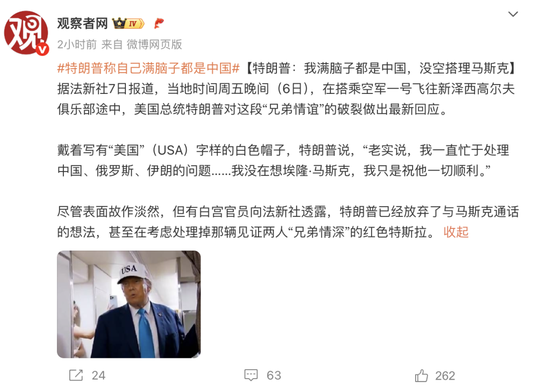 关注特朗普与马斯克“口水战”后续。 据观察者网援引法新社7日报道,当地时间周五晚间(6日),在搭乘空军一号飞往新泽西高尔夫俱乐部途中,美国总统特朗普对这段“兄弟情谊”的破裂做出最新回应。戴着写有 ...