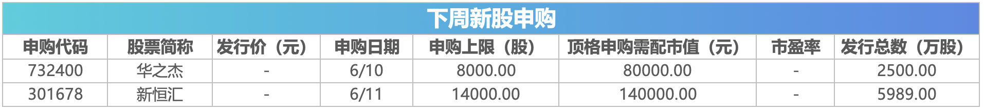 【重磅新闻】 CPI、PPI数据将公布 6月9日,国家统计局将公布5月CPI、PPI数据。 中金公司此前发布的研报分析预计,5月CPI同比或与4月持平于-0.1%。食品方面,5月中国寿光蔬菜价格指数同比下降16.3%,相较上月14.2%的降幅进一步加大。猪肉方面,从供应端来看,前期补栏的二次育肥陆续出栏,且二次育肥仍会继续滚动补栏,供给仍较强。同时,节假日需求不及往年,带动5月22省平均猪肉价格环比下跌0.6%。其他方面,预计以旧换新政策带动的非食品消费品仍将维持以价换量的态势,服务价格或温和复苏。 5月金融数据或将公布 下周或还将公布5月新增贷款、M2、社融等金融数据。 中金公司预计5月社融增速稳健,货币供应增速或继续上升。5月政府债净融资接近1.5万亿元,相比去年同期的高基数仍然实现同比多增。5月的新增信贷数量预计为6300亿元左右,较去年同期少增,一个重要的原因是政府债置换可能会降低信贷存量,但是5月社融同比增速预计可能持平在8.7%,新增社融或为2.2万亿元。由于4月财政存款增速较高,5月的投放进度如果加快,M2增速进一步上升的可能性较大,预计5月M2同比增速可能达到8.3%。 苹果全球开发者大会将召开 苹果全球开发者大会WWDC25将于北京时间6月10日至14日在线上举行。主题演讲定档在太平洋时间6月9日 (星期一) 上午10点,即北京时间6月10日(星期二)凌晨1点。作为一年一度最重要的科技盛宴,WWDC历年来都是苹果发布技术与产品的重要窗口。 下周467.09亿元市值限售股解禁 下周(6月9日至13日)A股有44只个股面临解禁,以6月6日收盘价计算,对应市值合计467.09亿元。有两家上市公司限售股解禁市值超过百亿元,分别是达梦数据的107.52亿元、华海清科的104亿元。 ![]() 【新股机会】 数据显示,下周将有2只新股发行,沪市主板有1只,创业板有1只,合计发行约8488.89万股,预计合计募资11.26亿元。具体来看,6月10日发行的是华之杰;6月11日发行的是新恒汇。 ![]() (文章来源:第一财经) |