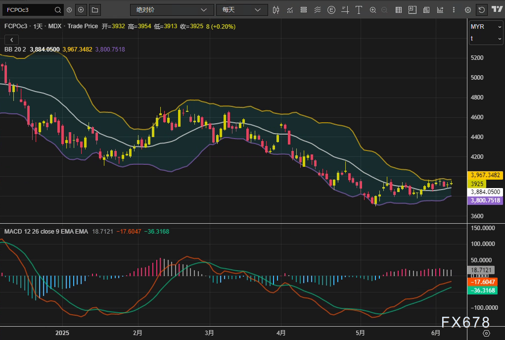 周一 6月9日 马来西亚衍生品交易所 BMD 棕榈油期货延续震荡格局 主力8月合约收盘报3925林吉特 吨 日内涨幅0 2 技术面呈现布林通道中轨附近胶着状态 日内行情主要受大连及芝加哥植物油市场联动影响 但交投情绪谨慎 ...