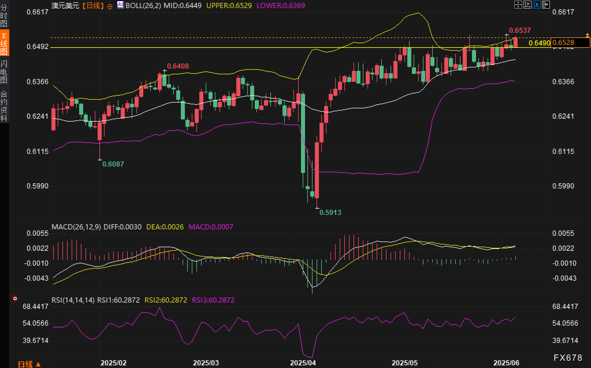 周一(6月9日),澳元兑美元汇价涨势强劲,盘中最高触及0.6537,创下七个月新高。此前一交易日汇价虽有所回撤,但今日迅速修复跌幅,显示多头力量仍占上风。欧洲时段汇价交投于0.6530附近,短线维持强势格局。 ![]() 技术面: 从日线图观察,澳元/美元维持在上升通道中运行,近几个交易日稳步推高,并成功突破前期重要高点0.6490的阻力位。最近交投于布林带上轨附近,表明汇价处于强势通道上缘,短期动能仍然旺盛。技术指标方面,MACD线与信号线维持金叉状态,柱状图红柱持续增长,预示多头动能未减。RSI指标运行在60上方,未出现超买,仍有上升空间。 ![]() 市场情绪观察 从市场情绪角度来看,澳元近期呈现明显的“买预期”走势。尽管外部经济数据未出现实质性大幅改善,但市场对于全球经济软着陆的期待使得风险货币表现强劲。此外,美元受政治与财政不确定性牵制,激发资金流出避险资产转向商品货币。 技术走势的连续突破,配合基本面逐步稳定,进一步增强了多头市场情绪。在汇价未跌破布林中轨和重要支撑前,多头情绪或将维持主导地位。但交易员警惕美联储未来政策指引变化对市场预期构成扰动。 后市展望 短期展望:若汇价稳守0.6490上方并突破0.6537高点,短线有望挑战0.66一线。技术指标无明显背离迹象,支持趋势延续。交易员关注美元走势和全球风险情绪变化。 中长期展望:尽管澳洲一季度GDP仅增长0.2%,不及预期,反映内需承压,但外部出口驱动型复苏预期仍为澳元提供中期支撑。分析认为若后续基本面进一步修复,汇价有望逐步向上拓展空间。然而,一旦美元重拾强势或市场风险情绪转弱,澳元或将面临阶段性调整压力。