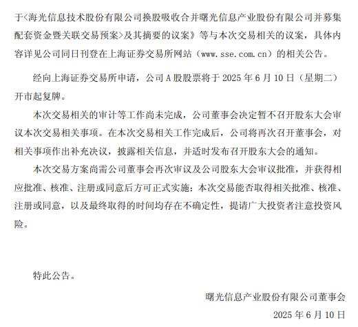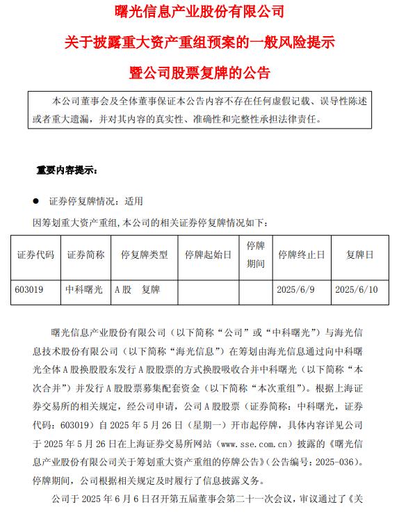 中科曙光(603019.SH)公告称,公司与海光信息筹划由海光信息通过向中科曙光全体A股换股股东发行A股股票的方式换股吸收合并中科曙光,并发行A股股票募集配套资金。参与本次换股的中科曙光股票为14.63亿股,若不考虑合并双方后续可能的除权除息等影响,按照换股比例1:0.5525计算,海光信息为本次换股吸收合并发行的股份数量合计为8.08亿股。吸收合并方换股价格为143.46元/股,被吸收合并方换股价格为79.26元/股。本次换股吸收合并中,海光信息拟购买资产的交易金额为换股吸收合并中科曙光的成交金额,为1159.67亿元。本次换股吸收合并完成后,中科曙光将终止上市,海光信息将承继及承接中科曙光的全部资产、负债、业务、人员、合同及其他一切权利与义务。公司A股股票将于2025年6月10日开市起复牌。 ![]() ![]() (文章来源:财联社) |