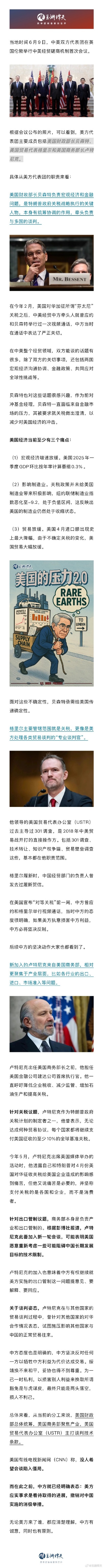 当地时间6月9日,中美双方代表团在英国伦敦举行中美经贸磋商机制首次会议。根据会议公布的照片,可以看到,美方代表团主要成员包括美国财政部长贝森特、美国贸易代表格里尔和美国商务部长卢特尼克。为什么是这三 ...