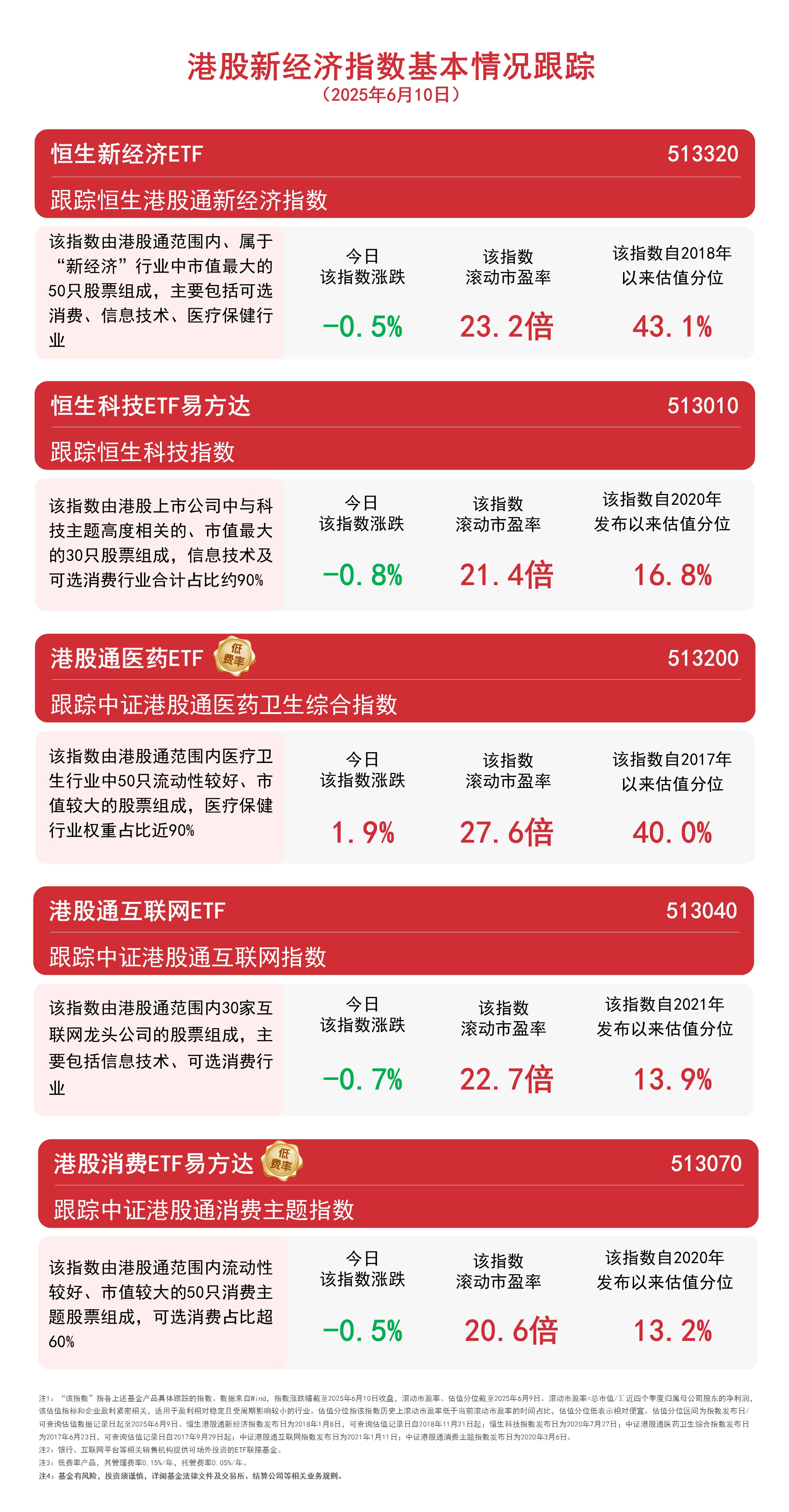 0港股今日表现分化,医药股延续涨势,科技、新消费股走弱。截至收盘,中证港股通医药卫生综合指数上涨1.9%,恒生港股通新经济指数、中证港股通消费主题指数均下跌0.5%,中证港股通互联网指数下跌0.7%,恒生科技指数下 ...