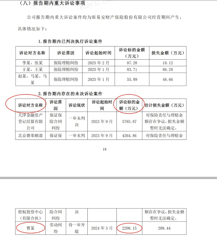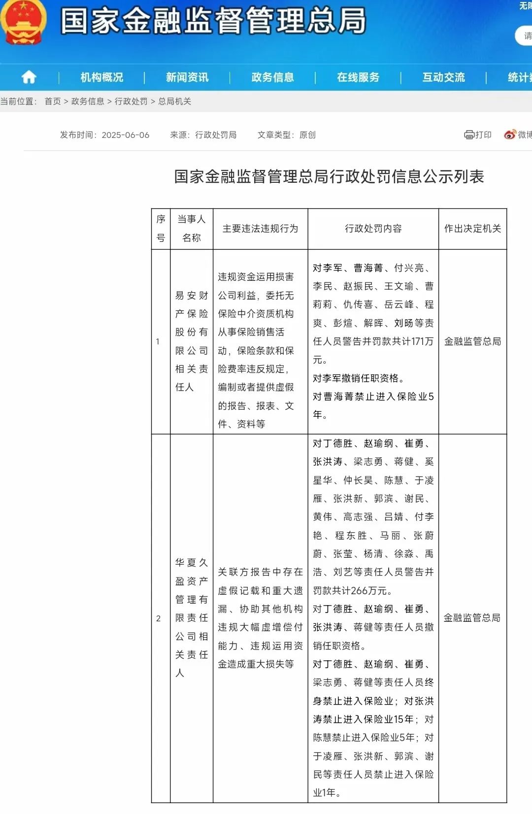 高管集中被禁业,实属罕见! 近日,金融监管总局发布两则行政处罚信息,一口气对易安财险、华夏久盈资管两家保险机构的38位相关机构责任人处以警告并罚款,同时对其中6位责任人处以撤销任职,其中12位责任人分别被处以禁业1年、5年、15年乃至终身的梯队处罚。从个人处罚历史记录来看,这创下近年来保险行业最严厉处罚纪录。 记者调查了解发现,这两家险企均为当年“明天系”旗下保险机构,目前均已通过股权转让、被接管等方式成功“改头换面”。从监管给出的“被罚责任人名单”和“主要违法违规行为”来看,此番遭监管“铁腕清算”的人员多为两家险企时任和已离任的高管及中层,违法违规行为时间跨度长、责任链条广、风险性质严重,不仅反映了个别险企内部治理与风控机制的严重缺失,也暴露出早期保险行业粗放扩张、监管套利的积弊未除。 业内对此旧案重提、秋后算账的关注背后,绝不仅仅是对这两家问题险企抱以看官心态。高管集体失职、纵容违法违规行为滋生,于总资产规模动辄上亿元的险企而言,公司治理何以千疮百孔?当监管举起“终身禁业”的利剑,亮明“穿透式监管”的底线,所有顶风作案、铤而走险、心存侥幸都将在阳光下无处遁形。而对相关责任人被穿透式追责,也是回应公众关切、重建市场信心的必要步骤。 “终身禁业”这类极端处罚的出现,亦标志着保险监管已从过去对机构为主的处罚逻辑,逐步转向对“关键少数”个人责任的问责。这种方式不仅提高了高管履职的合规边际成本,也强化了行业的行为约束机制,有利于推动保险机构真正建立起与资本金体量和风险责任相匹配的合规文化。 38人被罚 近日,金融监管总局在官网发布两张罚单,直指易安财险、华夏久盈资管违法违规的“旧账”。值得注意的是,两张罚单受罚对象均为个人,而非公司,且受罚人数较多。 ![]() 图片来源:金融监管总局 针对易安财险的罚单披露显示,易安财险相关责任人存在以下违法违规行为:违规资金运用损害公司利益,委托无保险中介资质机构从事保险销售活动,保险条款和保险费率违反规定,编制或者提供虚假的报告、报表、文件、资料等。 为此,金融监管总局对李军、曹海菁、付兴亮、李民、赵振民、王文瑜、曹莉莉、仇传喜、岳云峰、程爽、彭煊、解晖、刘旸等责任人员警告并罚款共计171万元。对李军撤销任职资格。对曹海菁禁止进入保险业5年。 其中,被撤销任职资格的李军曾任易安财险董事长,被禁业的曹海菁曾任易安财险总经理,其余被罚责任人分别曾任易安财险合规、精算、财务等重要岗位负责人。 2007年12月至今,李军担任深圳银之杰股份有限公司总经理。作为重要股东,银之杰曾持有易安财险15%的股权。2016年4月,李军任易安财险董事长。 针对华夏久盈资管的罚单披露显示,华夏久盈资管相关责任人存在以下违法违规行为:关联方报告中存在虚假记载和重大遗漏、协助其他机构违规大幅虚增偿付能力、违规运用资金造成重大损失等。 为此,金融监管总局对丁德胜、赵瑜纲、崔勇、张洪涛、梁志勇、蒋健、奚星华、仲长昊、陈慧、于凌雁、张洪新、郭滨、谢民、黄伟、高志强、吕婧、付李艳、程东胜、马丽、张蔚蔚、张莹、杨清、徐淼、禹浩、刘艺等责任人员警告并罚款共计266万元。对丁德胜、赵瑜纲、崔勇、张洪涛、蒋健等责任人员撤销任职资格。 不仅如此,金融监管总局还对丁德胜、赵瑜纲、崔勇、梁志勇、蒋健等责任人员终身禁止进入保险业;对张洪涛禁止进入保险业15年;对陈慧禁止进入保险业5年;对于凌雁、张洪新、郭滨、谢民等责任人员禁止进入保险业1年。其中,丁德胜曾任华夏久盈资管董事长,赵瑜纲曾任华夏久盈资管总经理,其余被罚责任人分别曾任华夏久盈资管投资、董办、合规等重要岗位负责人。 业内人士评价称,监管部门对于一家公司不同责任人作出梯队式禁业处罚的决定,这在保险行业鲜见。足以可见这家公司在合规等问题上的千疮百孔。 改头换面挑战仍存 追溯上述两家险企历史不难发现,易安财险、华夏久盈资管均为当年“明天系”旗下保险机构,目前均已通过股权转让、被接管等方式成功“改头换面”。 当年“明天系”旗下有多张保险牌照,除规模最小的易安财险外,还有华夏人寿、天安人寿和天安财险等。其中,华夏久盈资管是华夏人寿旗下控股的保险资管公司。 2020年7月17日,鉴于天安财险、华夏人寿、天安人寿、易安财险触发了《中华人民共和国保险法》第一百四十四条规定的接管条件,原中国银保监会决定对上述机构实施接管。2022年6月29日,原中国银保监会原则同意易安财险进入破产重整程序。 之后,易安财险完成了市场化重组。2023年5月6日,原中国银保监会批复同意比亚迪控股子公司比亚迪汽车工业有限公司受让易安财险100%股权,易安财险成为比亚迪全资控股的财险公司。此后,易安财险获批更名为“深圳比亚迪财产保险有限公司”。 此次最严厉罚单的落地,被一些业内人士解读为“旧账或已了,转型迎契机”。但从已公开迹象可循,这或许只是揭开了这家险企昔日种种问题的“冰山一角”。从其近期披露的相关公告来看,目前仍面临“旧案”诉讼纠纷缠身的境遇。这无疑为正在重整改革中的公司带来一定的挑战。 比亚迪财险在中国保险行业协会官网披露的2025