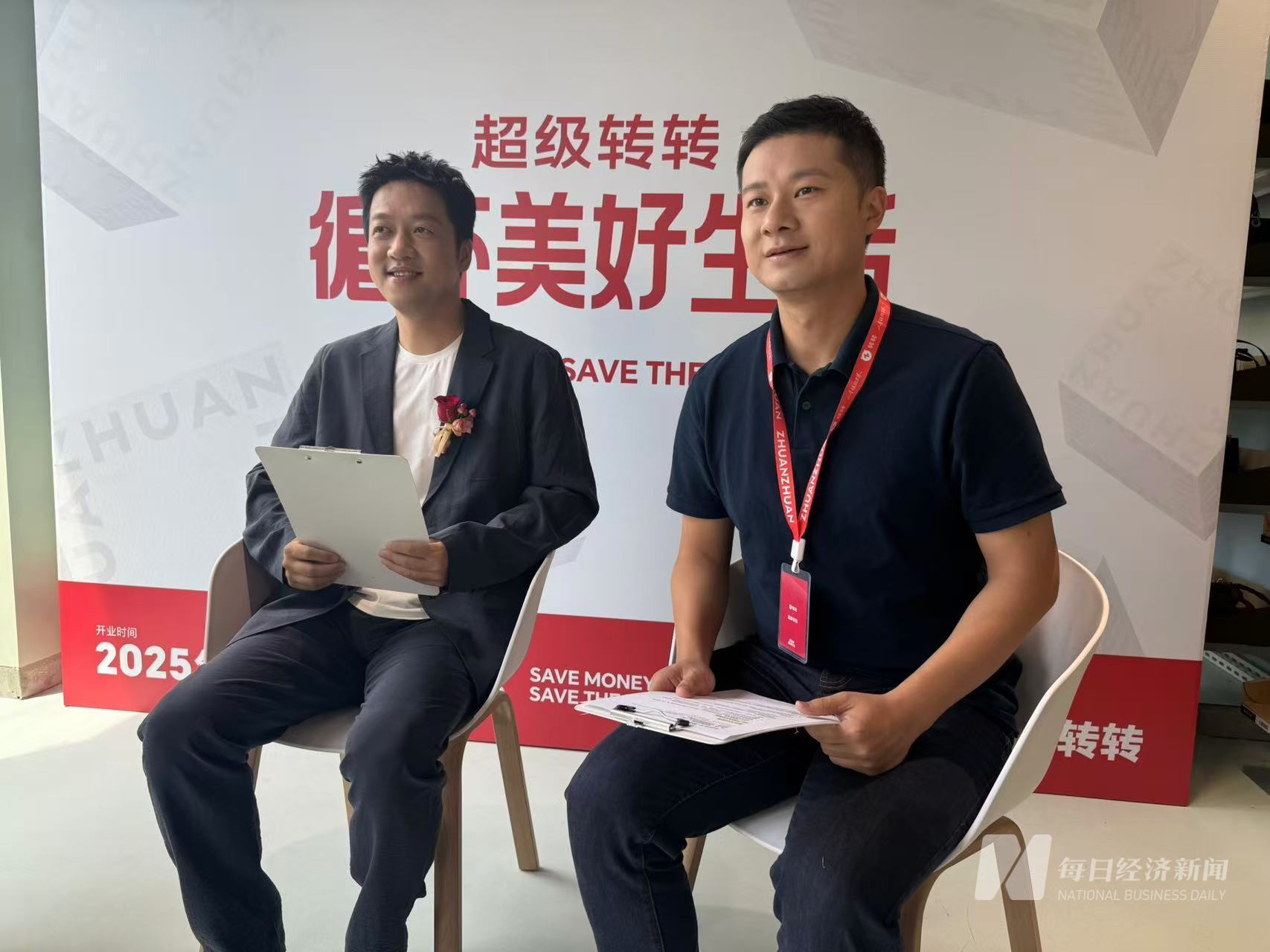 和传统印象不同的是,这个仓储式二手店铺中少了奢侈品专柜的“仪式感”,取而代之的是一种自由氛围——消费者看中二手商品可以现场用手机扫码下单,也可以扫码了解商品几成新、价格和瑕疵点。 “我自己就是‘I人’(内向型人格),这种不被打扰、自由探索的购物体验很重要。”在超级转转开业现场,转转创始人兼CEO黄炜在接受包括《每日经济新闻》记者在内的媒体采访时表示,“转转的仓库里经常摆放着各种鉴定过的商品,我们突然发现,可以直接把仓库放在店里向消费者展现,这就是开这家线下店最早的想法。” ![]() 黄炜(左)胡伟琨(右)接受媒体采访 图片来源:每经记者 赵雯琪 摄