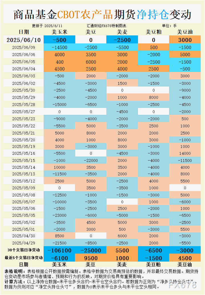 周三(6月11日),CBOT谷物期货市场呈现震荡走势,美玉米主力合约上涨0.34%至4.39-1/2美元/蒲式耳,美大豆微涨0.09%至10.57-1/2美元/蒲式耳,美小麦上涨0.19%至5.35-1/2美元/蒲式耳,美豆油下跌0.17%,美豆粕微涨0.03%。近期市场情绪受到多重因素驱动,包括中美经贸磋商的乐观预期、美国中西部作物生长改善、巴西大豆出口动态以及俄乌局势对全球粮食供应的潜在影响。持仓数据显示,商品基金在过去30个交易日对玉米和大豆转为净空头,对小麦保持净多头,而豆油和豆粕持仓则呈现分化。结合基本面与基差变动,本文将深入分析各品种的持仓变化、市场情绪及对价格走势的潜在影响,并展望未来趋势。 ![]() 过去30个交易日,商品基金在CBOT玉米期货的净空头持仓增加106100手,最近5个交易日新增净空头6100手,显示市场对玉米价格的看空情绪持续增强。6月10日,基金进一步增加投机性净空头,反映出交易者对美国国内供应宽松的预期。美国农业部最新作物进展报告显示,截至6月8日,美国玉米优良率升至71%,较前一周提高2个百分点,超出市场预期,表明中西部地区天气条件改善,作物生长良好。然而,出口需求端提供一定支撑,中美经贸磋商的乐观进展提振市场风险偏好,6月装船的CIF玉米驳船基差较CBOT7月合约(CN25)上涨1美分/蒲式耳至67美分/蒲式耳,FOB出口升贴水稳定在82美分/蒲式耳,显示出口需求稳中有升。巴西6月玉米出口预计增加,全球供应竞争可能限制美玉米价格上行空间。展望短期,玉米价格可能在4.30-4.50美元/蒲式耳区间震荡,受制于供应宽松压力,但若谈判取得实质进展,远月合约可能因出口预期改善而获得支撑。 美大豆:多空交织,贸易谈判与供应压力并存 CBOT大豆期货过去30个交易日净空头持仓增加25000手,但最近5个交易日转为净多头9500手,显示市场情绪有所回暖。6月10日,基金持仓多空平衡,反映交易者在当前价位上的观望态度。基本面看,中美经贸磋商的乐观情绪推动大豆价格逼近两周高点10.57-1/2美元/蒲式耳,交易商预计两国可能在关税和出口限制问题上达成框架协议,利好美国作为全球第二大大豆出口国的市场前景。然而,美国农业部报告显示大豆优良率升至68%,作物生长条件改善,叠加巴西6月出口预计达1408万吨,全球供应充裕限制价格上行。基差方面,6月装船的CIF大豆驳船基差较CBOT7月合约(SN25)上涨1美分/蒲式耳至70美分/蒲式耳,FOB出口升贴水上涨2美分/蒲式耳至80美分/蒲式耳,显示出口需求温和回暖。短期内,大豆价格可能在10.40-10.70美元/蒲式耳区间波动,远月合约受贸易谈判进展和美豆播种面积下调预期的支撑,存在上行潜力。 美小麦:净多头持仓延续,俄乌局势与天气风险并存 CBOT小麦期货过去30个交易日净多头持仓增加5500手,最近5个交易日新增净多头1000手,显示市场对小麦价格的看多情绪较为稳定。6月10日,基金增加投机性净空头,反映短期获利了结压力。美国农业部报告显示,春小麦和冬小麦作物评级超出预期,优良率提升,但俄乌局势对全球小麦供应的潜在影响仍令市场保持警惕。一家知名机构指出,俄罗斯2025年粮食收成预计增至1.35亿吨,较去年增加500万吨,供应宽松预期压制价格。然而,埃及近期招标采购380万吨小麦,显示全球需求依然强劲。基差方面,小麦现货市场基差未见明显波动,反映供需相对平衡。技术面看,7月芝加哥软红冬小麦(SRW)合约在5.06-1/4美元/蒲式耳的低点形成看涨旗形,短期内可能测试5.50美元/蒲式耳阻力位。展望未来,小麦价格可能在5.30-5.60美元/蒲式耳区间运行,俄乌局势和美国平原地区降雨对价格的影响需密切关注。 美豆粕:空头情绪占优,饲料需求提供支撑 CBOT豆粕期货过去30个交易日净空头持仓增加6500手,最近5个交易日新增净空头1500手,显示市场对豆粕价格的看空情绪占主导。6月10日,基金持仓多空平衡,反映交易者在当前价位上的谨慎态度。基本面看,欧盟2024/25年度豆粕进口量增至1820万吨,同比增长25%,显示饲料需求强劲。伊朗近期招标采购12万吨豆粕,吸引多方报价,进一步支撑需求预期。然而,巴西植物油行业协会维持2024/25年度豆粕出口预测不变,为2360万吨,供应充足限制价格上行。国内市场方面,豆粕现货供应宽松,但油厂压榨利润偏低支撑挺价情绪,短期内豆粕盘面偏强运行。价格方面,基准合约周二收高0.1%,显示市场在需求与供应压力间寻找平衡。展望短期,豆粕价格可能在当前水平附近震荡,若中美谈判进一步提振大豆需求,远月合约可能获得支撑。 美豆油:多头情绪回暖,生物燃料政策影响显现 CBOT豆油期货过去30个交易日净空头持仓增加3000手,但最近5个交易日转为净多头4500手,显示市场情绪有所好转。6月10日,基金增加投机性净多头,反映对豆油价格的看多预期增强。基本面看,美国能源信息署预测,由于联邦税收抵免政策调整,美国2025年生物柴油和可再生柴油进口量将大幅减少,利好国内豆油需求,推升基准合约周二收高0.9%。然而,马来西亚棕榈油库存升至199万吨,创八个月高位,且国际原油价格走低,拖累豆油价格上行空间。基差方面,豆油现货市场基差未见明显变化,反映供需平稳。国内市场数据显示,进口巴西大豆压榨利润下降,7-9月船期现货压榨利润仅20-70元/吨,油厂挺价意愿增强。展望短期,豆油价格可能在当前水平附近窄幅震荡,若生物燃料需求持续改善,远月合约可能测试更高阻力位。 未来趋势展望 CBOT谷物期货市场短